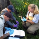 Biologists record duck band data and swab for avian influenza before releasing the wood duck back into the wild.