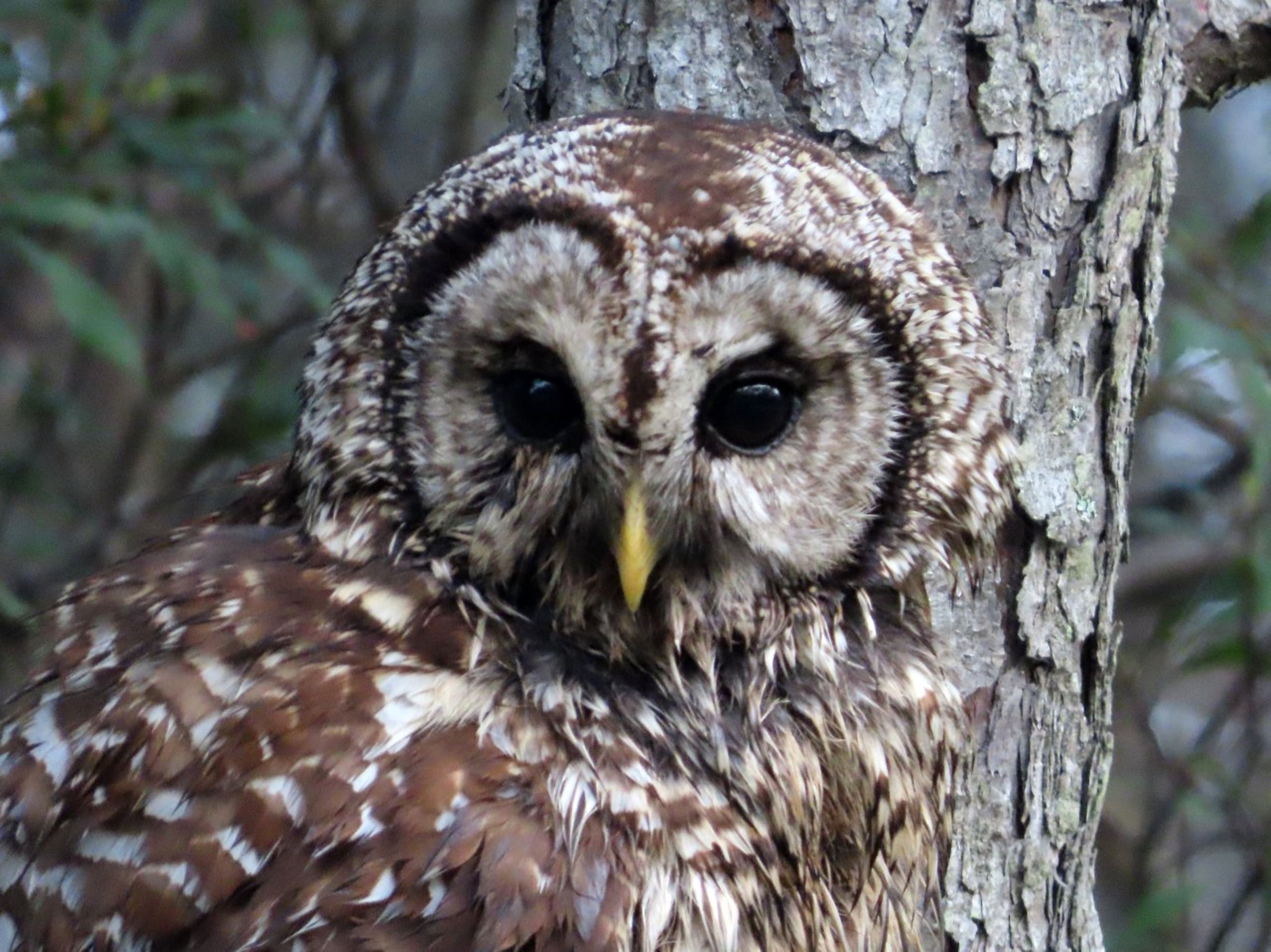 White and brown barred owl sitting on tree branch next to the tree trunk