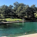 People enjoy swimming and picnicking around Barton Springs pool in Austin, Texas.