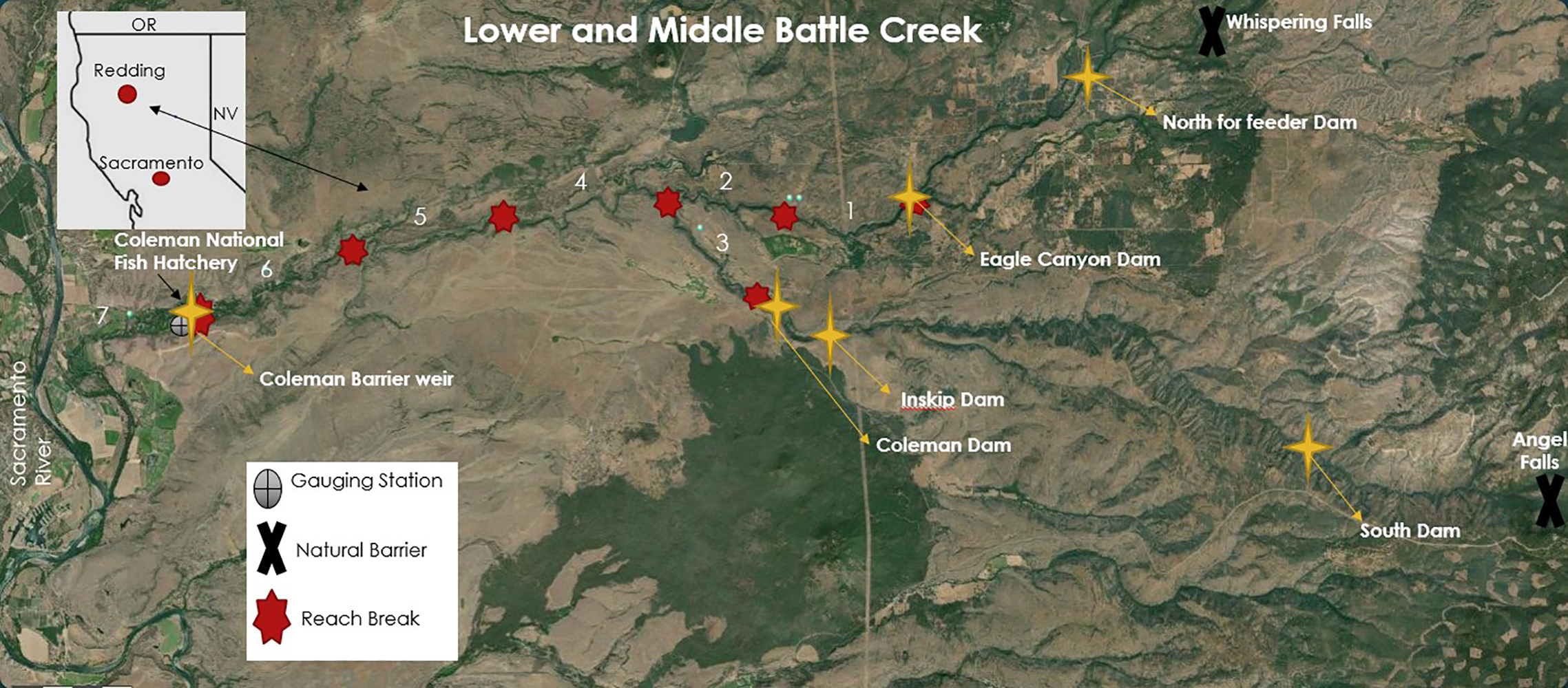 This map shows the study areas on Battle Creek, California, where the Red Bluff Fish and Wildlife Office conducts monitoring of federally listed salmonids. These efforts focus on studying the effects of stream restoration, dam removal, new fish ladder construction and water acquisition projects to promote access to holding, spawning and rearing habitats critical to survival and recovery of salmonids.