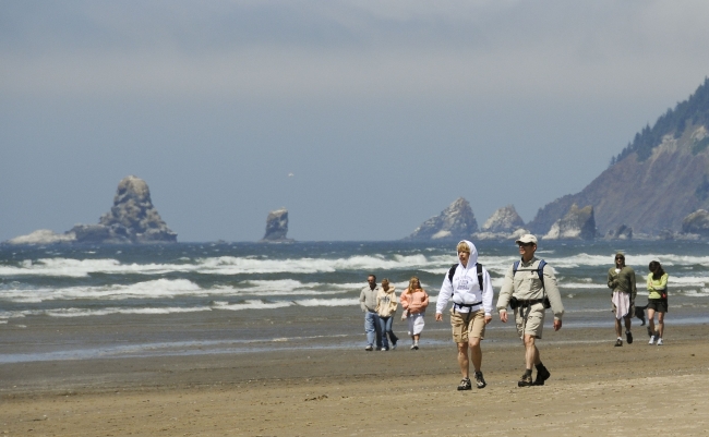 Beachgoers walking along the coast on Oregon Islands Refuge.