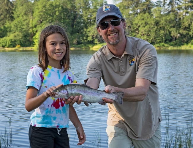 Catch of the day! Bella proudly poses with a Service employee holding her first ever fish. This trout was one of largest caught at this Service event for Big Brothers Big Sisters of Southwest Washington.