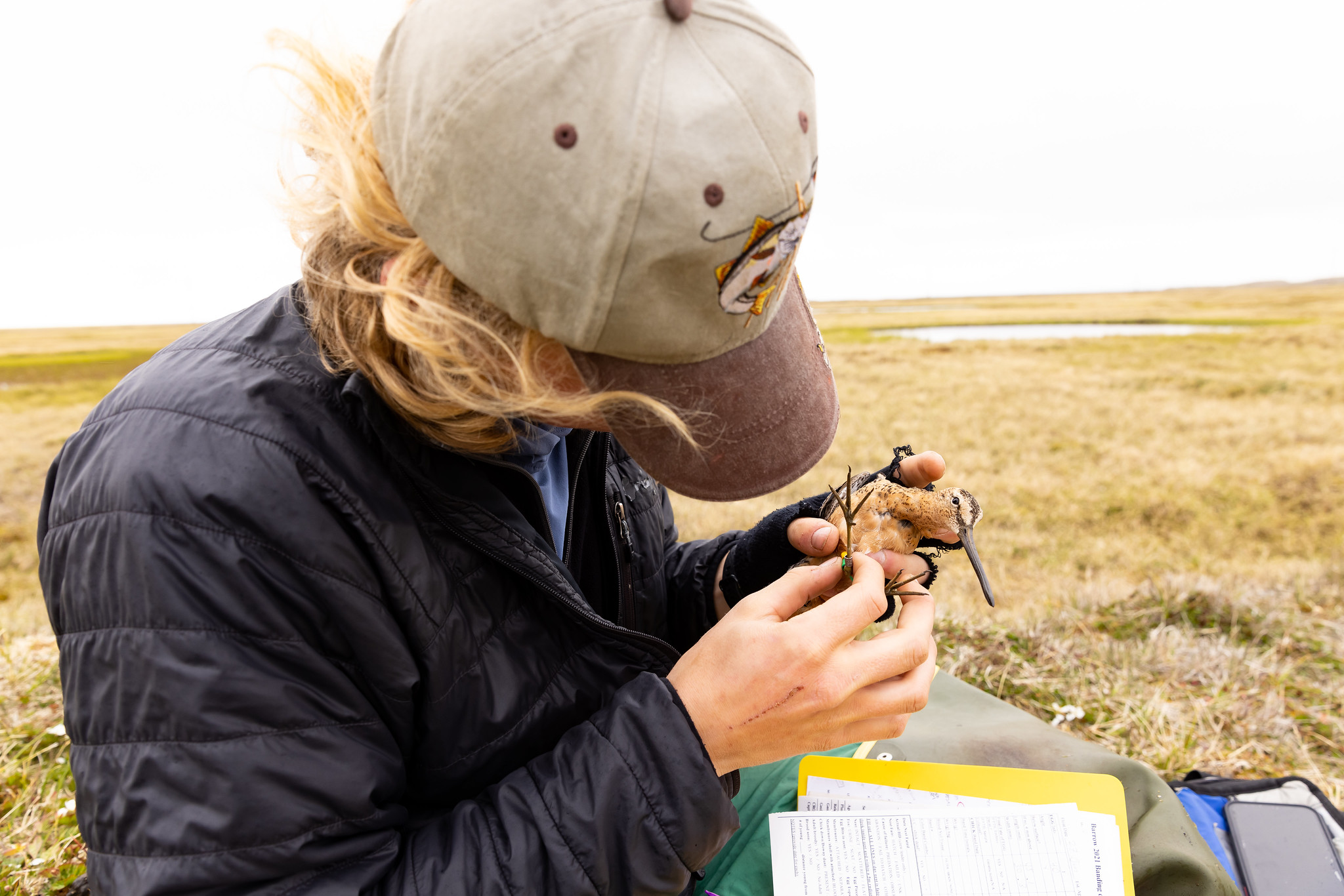 A biologist checks the band on the leg of a long-billed dowitcher.