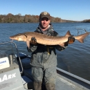 Erwin National Fish Hatchery Fish Biologist, David Teague, holding a lake sturgeon captured during annual sampling efforts on Tennessee River.