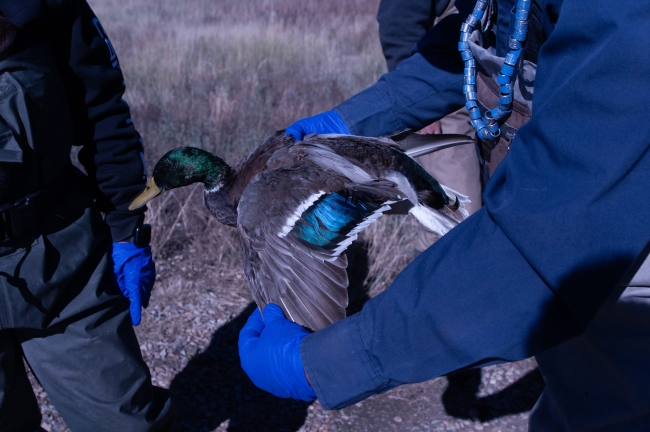 Biologist looking at mallard.