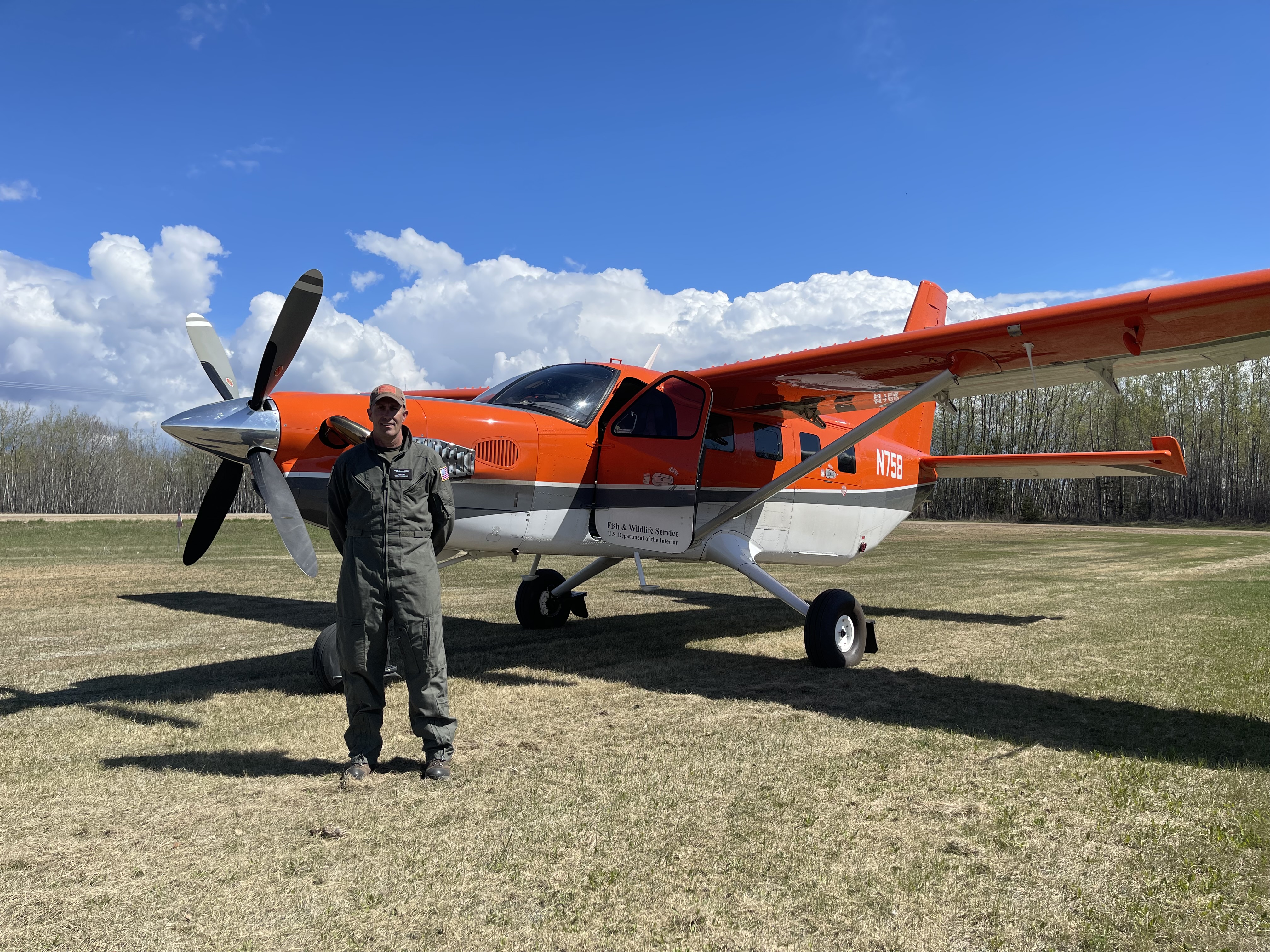 Wildlife biologist, Chris Cain, stands in front of an N758 aircraft in Good Soil, Saskatchewan. This picture was taken as part of the Waterfowl Breeding Population and Habitat Survey.