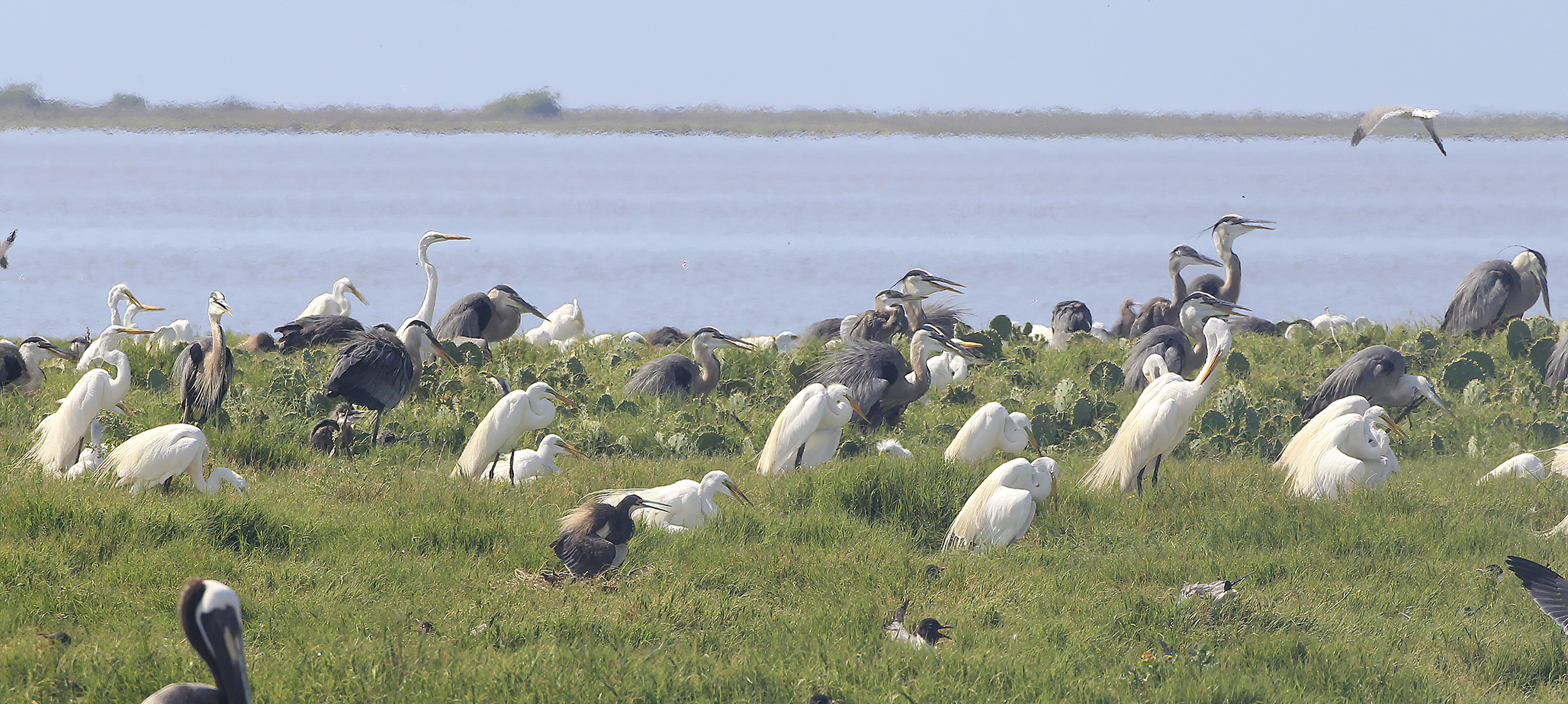 Colonial waterbirds including great egret, great blue heron, tricolored heron and laughing gull nest in groups on the low-laying islands along the Texas coast.