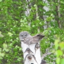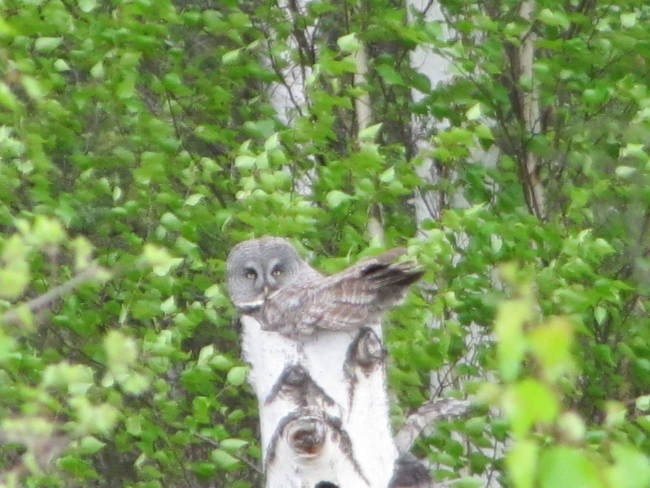 Taking photos of an owl in the early dawn light isn't easy! This great gray owl perched above the Kanuti River and biologists photographed it while boating by on a survey.