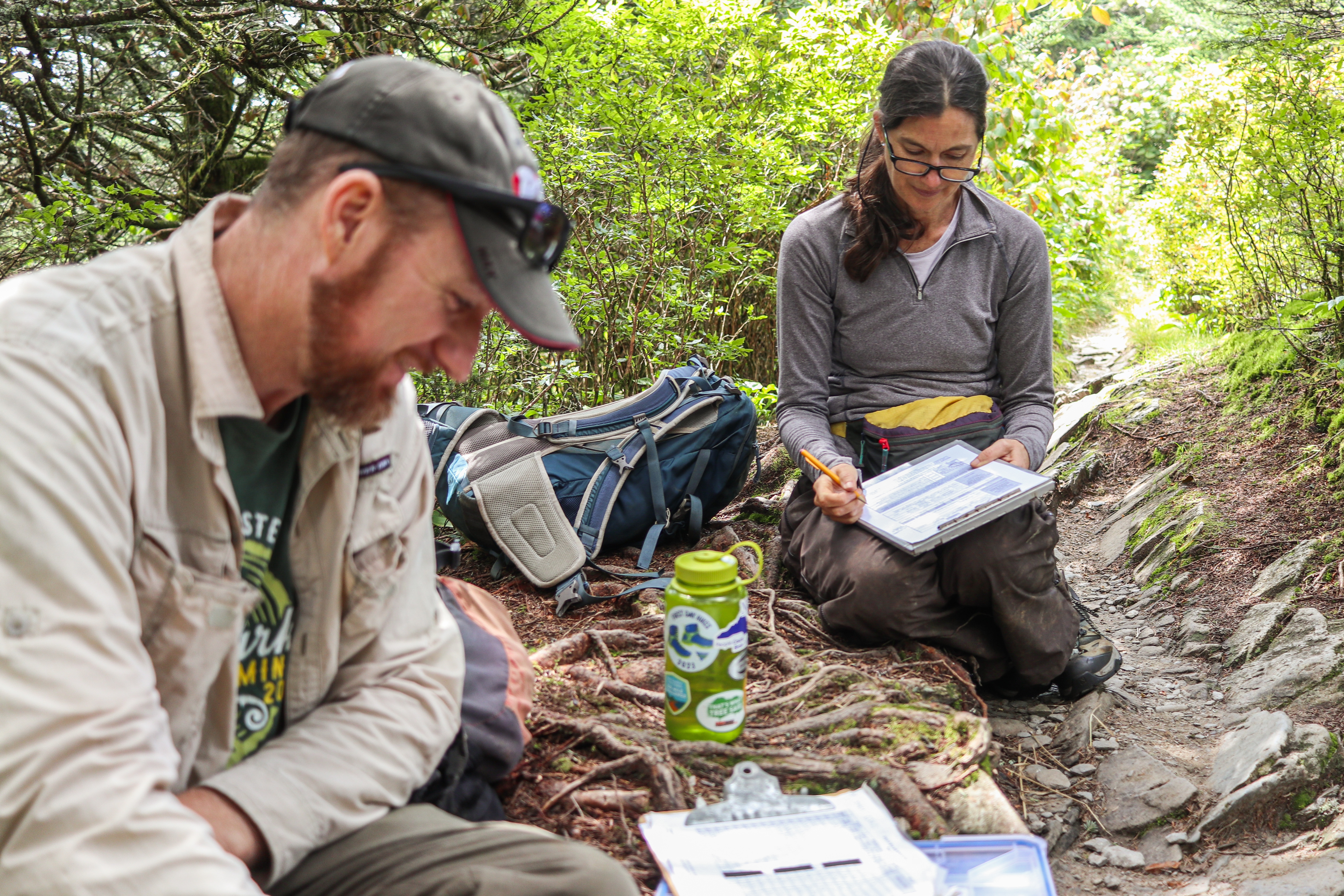 Brian Bockhahn, NC State Parks, and Sue Cameron, US Fish and Wildlife Service, wrap up field notes during a search for spruce-fir moss spiders in Great Smoky Mountains National Park.