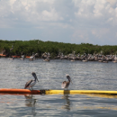 Brown pelicans on oil containment boom after the 2010 Deepwater Horizon oil spill in the Gulf of Mexico