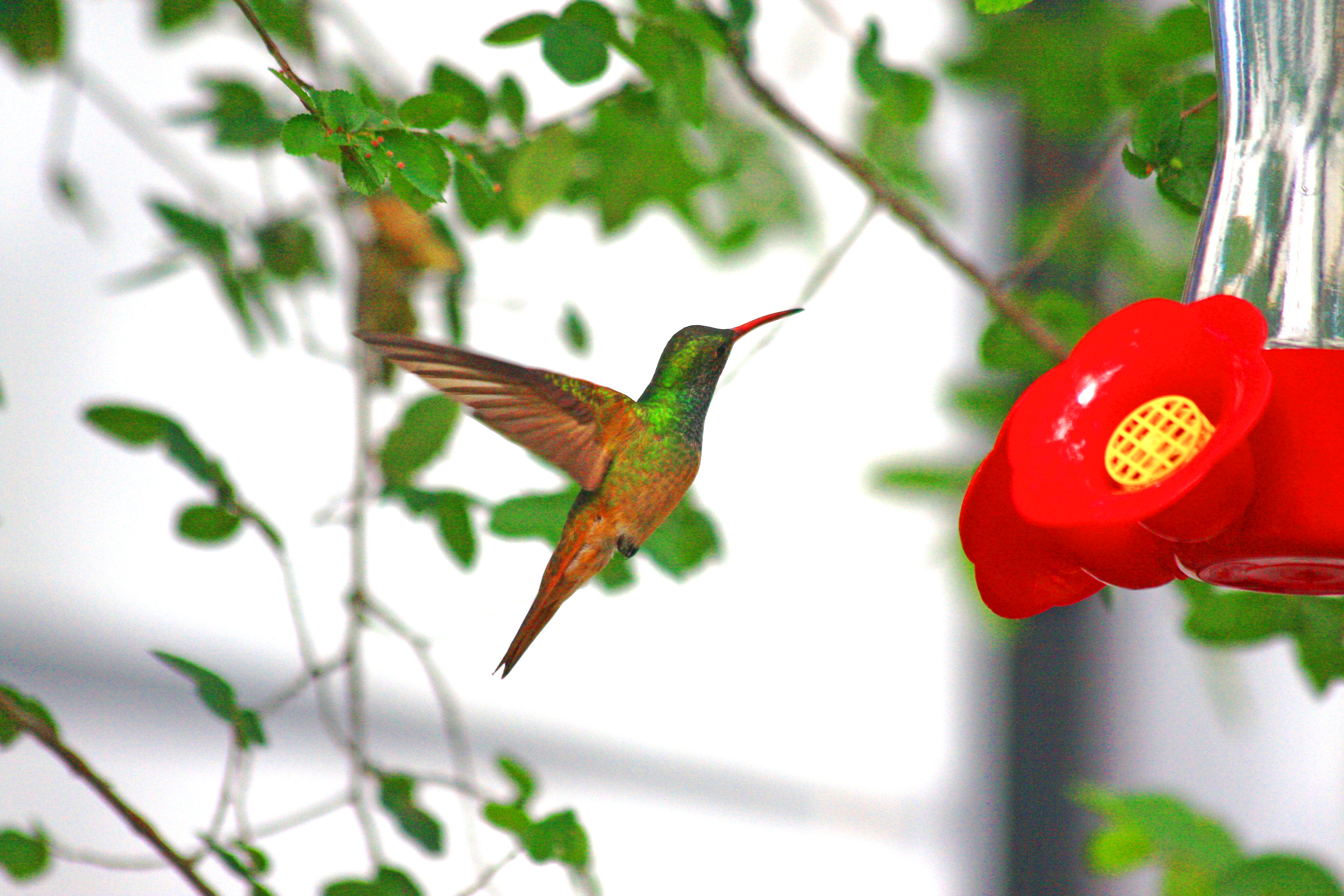 A buff-bellied hummingbird hovers near a bird feeder at Santa Ana Refuge in south Texas.