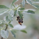 A bumble bee clinging to an alfalfa leaf.