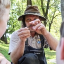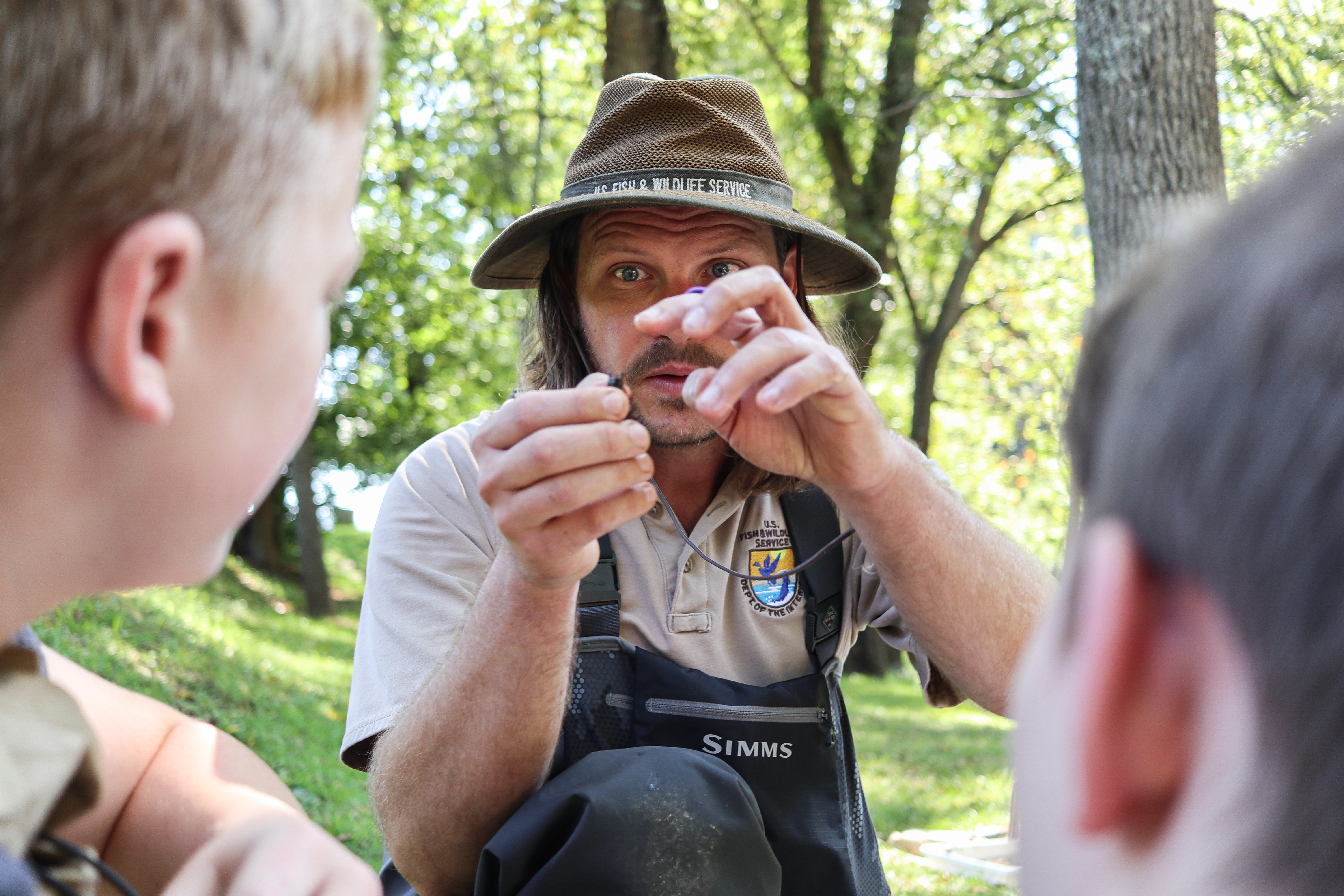 Byron Hamstead hold up an aquatic insect while discussing it with a pair of Haywood County, N.C. students.
