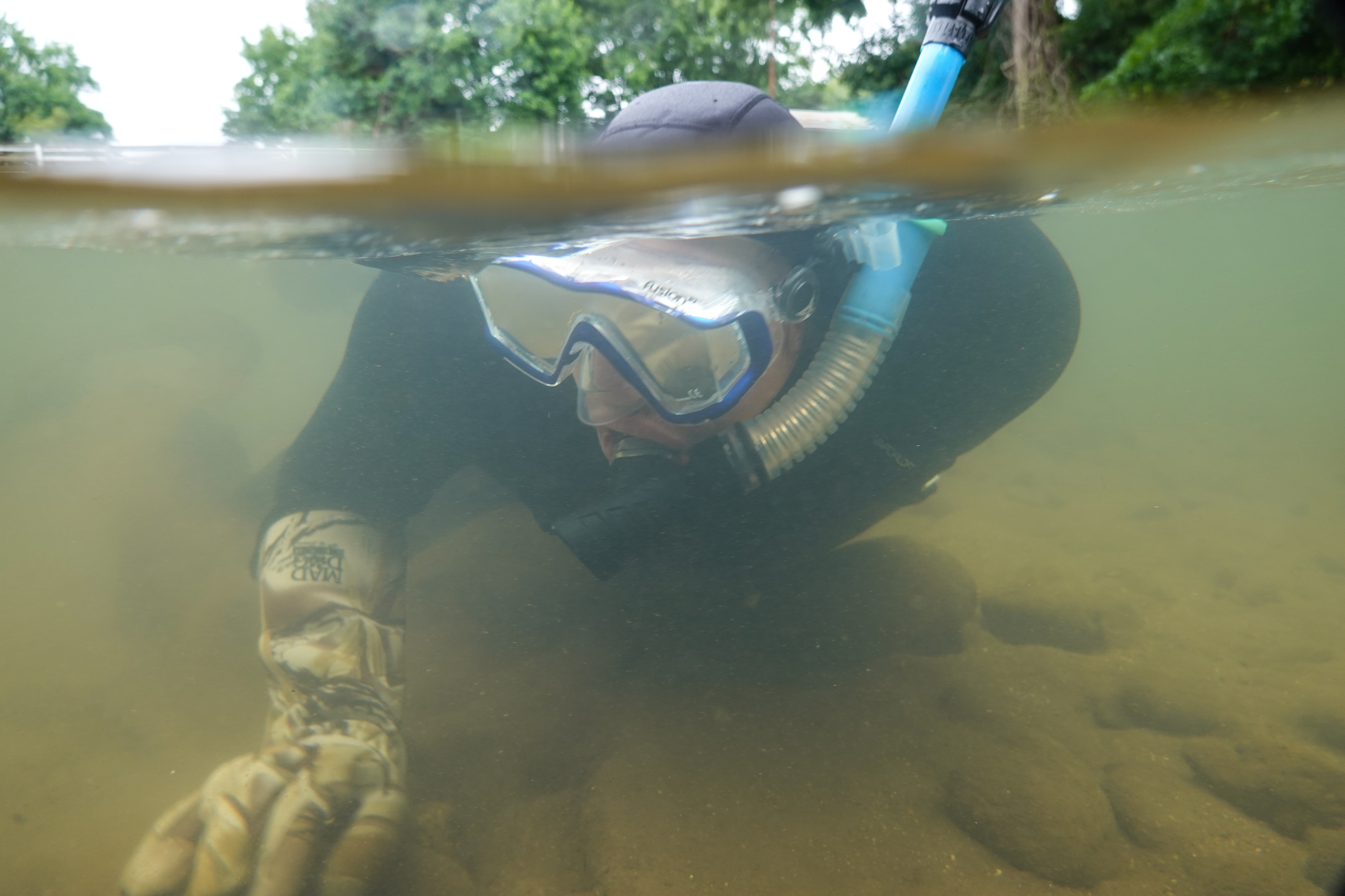 Byron Hamstead, USFWS, searches for Appalachian elktoe mussels in the East Fork of the Pigeon River. Haywood County, NC.