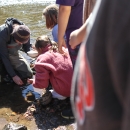 Byron Hamstead works with Mitchell County, N.C. students to find aquatic invertebrates along the edge of the North Toe River.