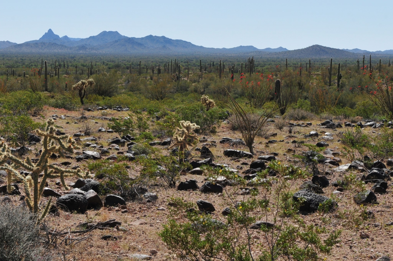 Cabeza Prieta National Wildlife Refuge landscape view with basalt rock, cholla, ocotillo, creosote, and cacti.