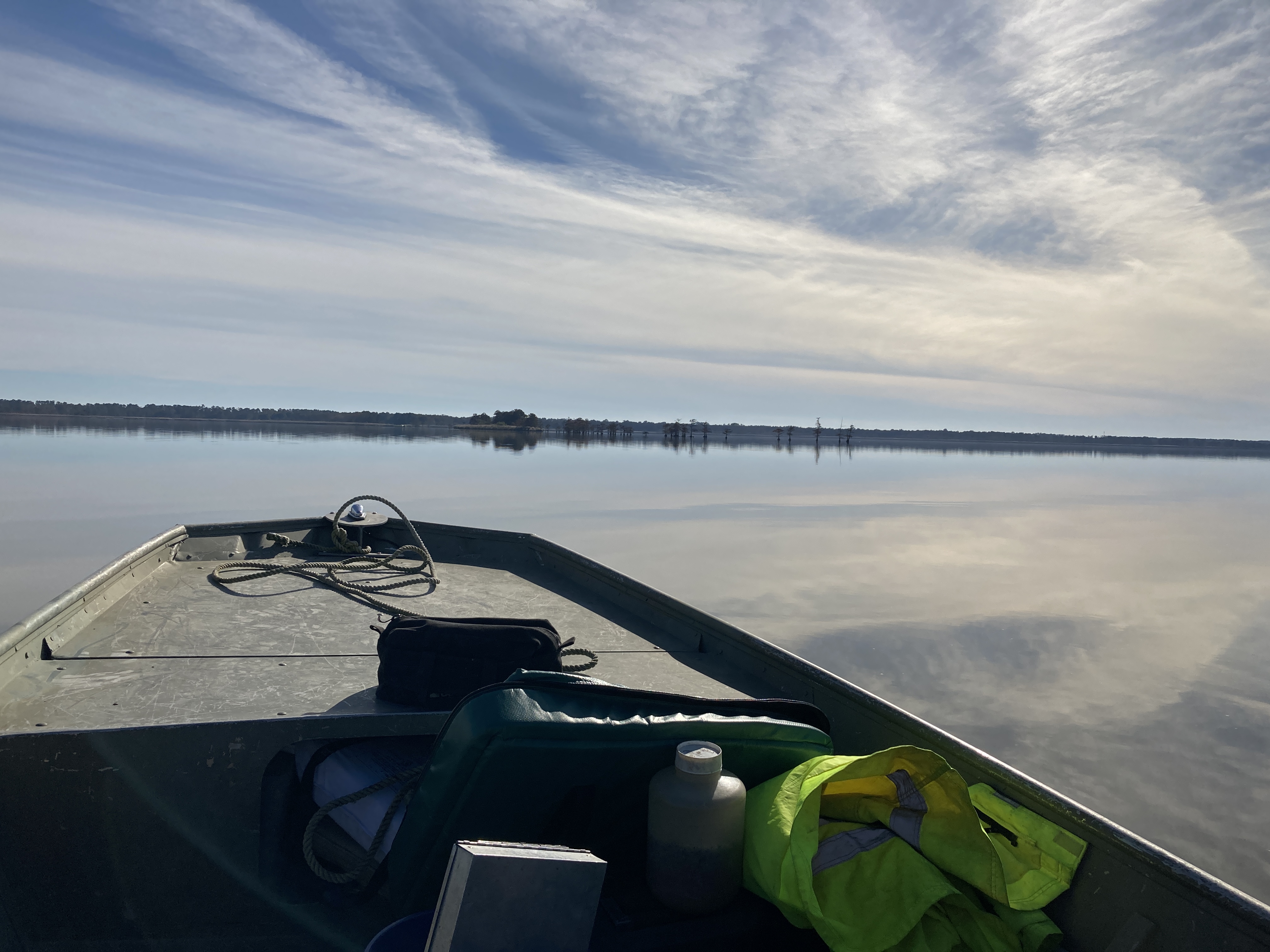 USFWS staff and USGS partners experienced this calm moment on Lake Mattamuskeet on their way to service the two continuous water quality monitoring stations in the lake.