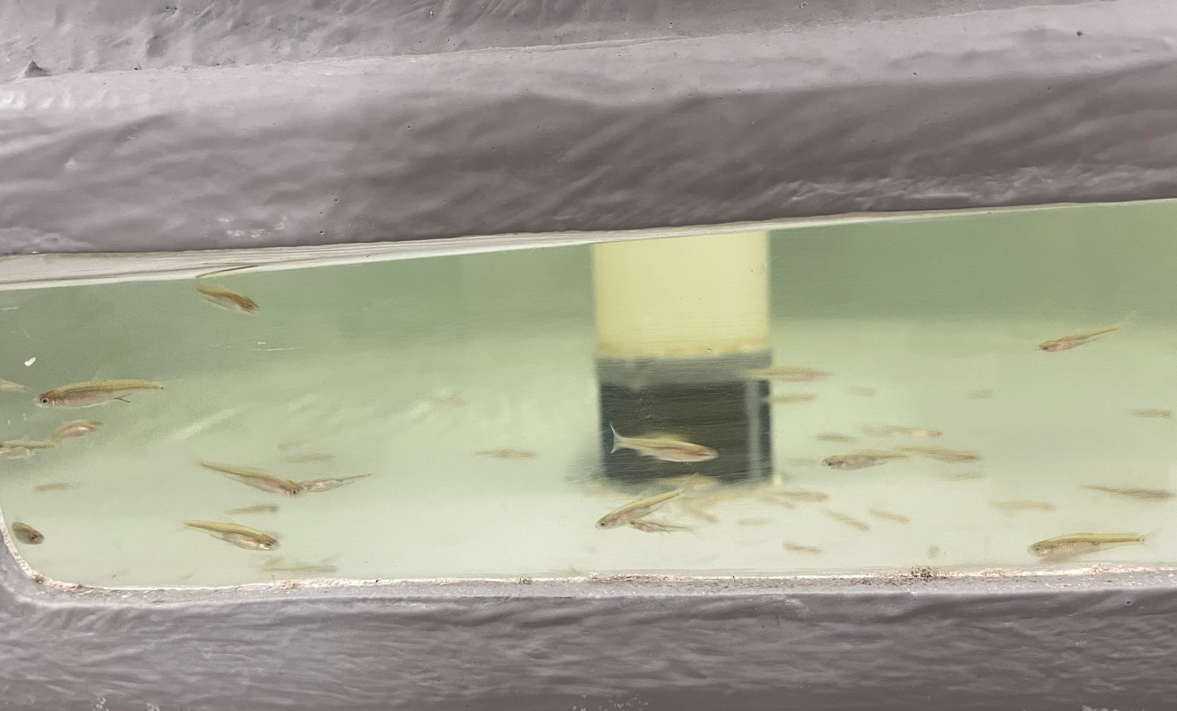 Young Cape Fear shiners as seen through a window in the tank at Edenton National Fish Hatchery.