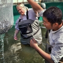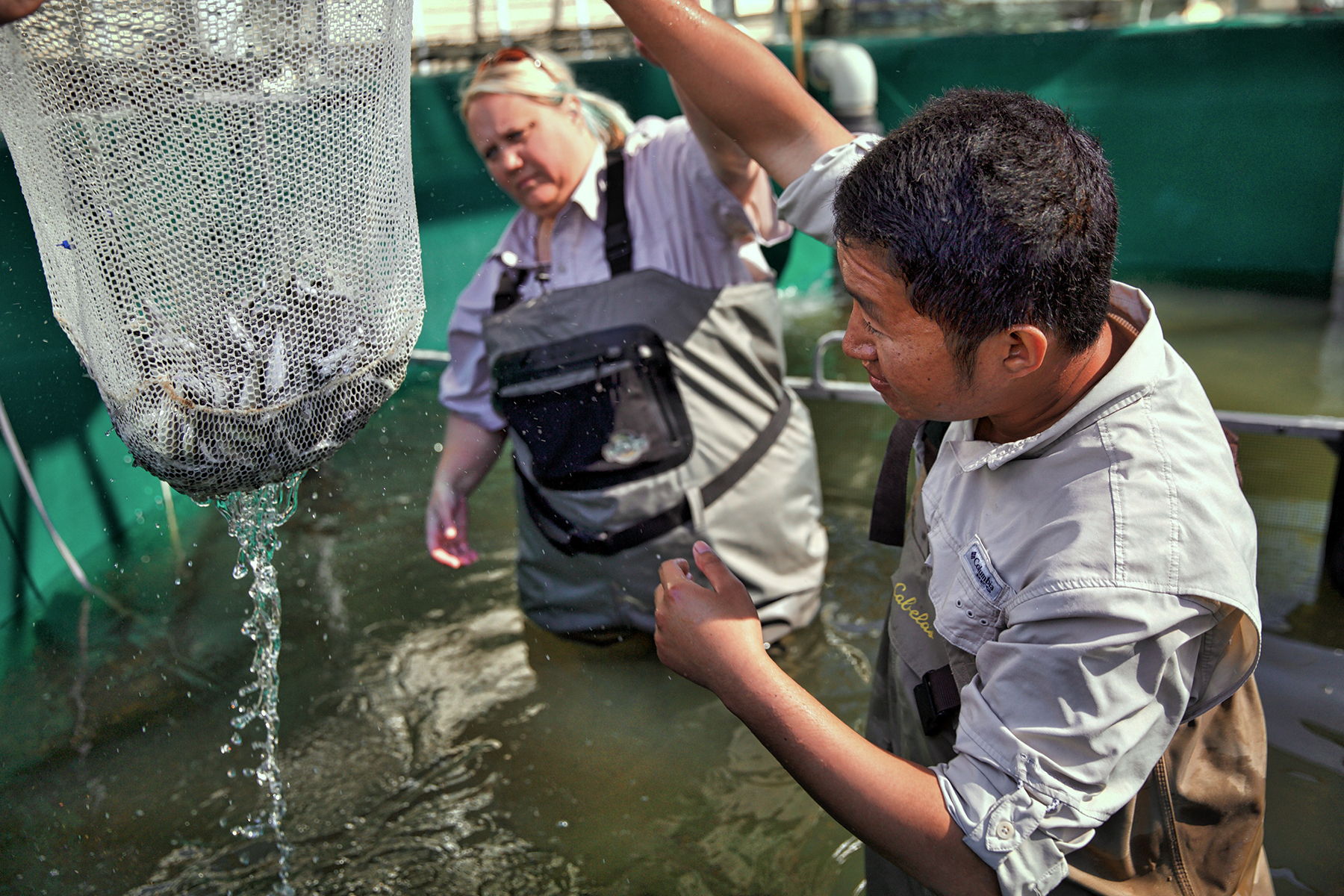 Melanie Cardillo, left, and Alex Xiong, scientific aides from the California Department of Fish and Wildlife, empty a holding tank at the Interim Salmon Conservation and Research Facility near Fresno.