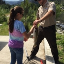Josh Homer hands a girl her rainbow trout after helping her bring it to shore.