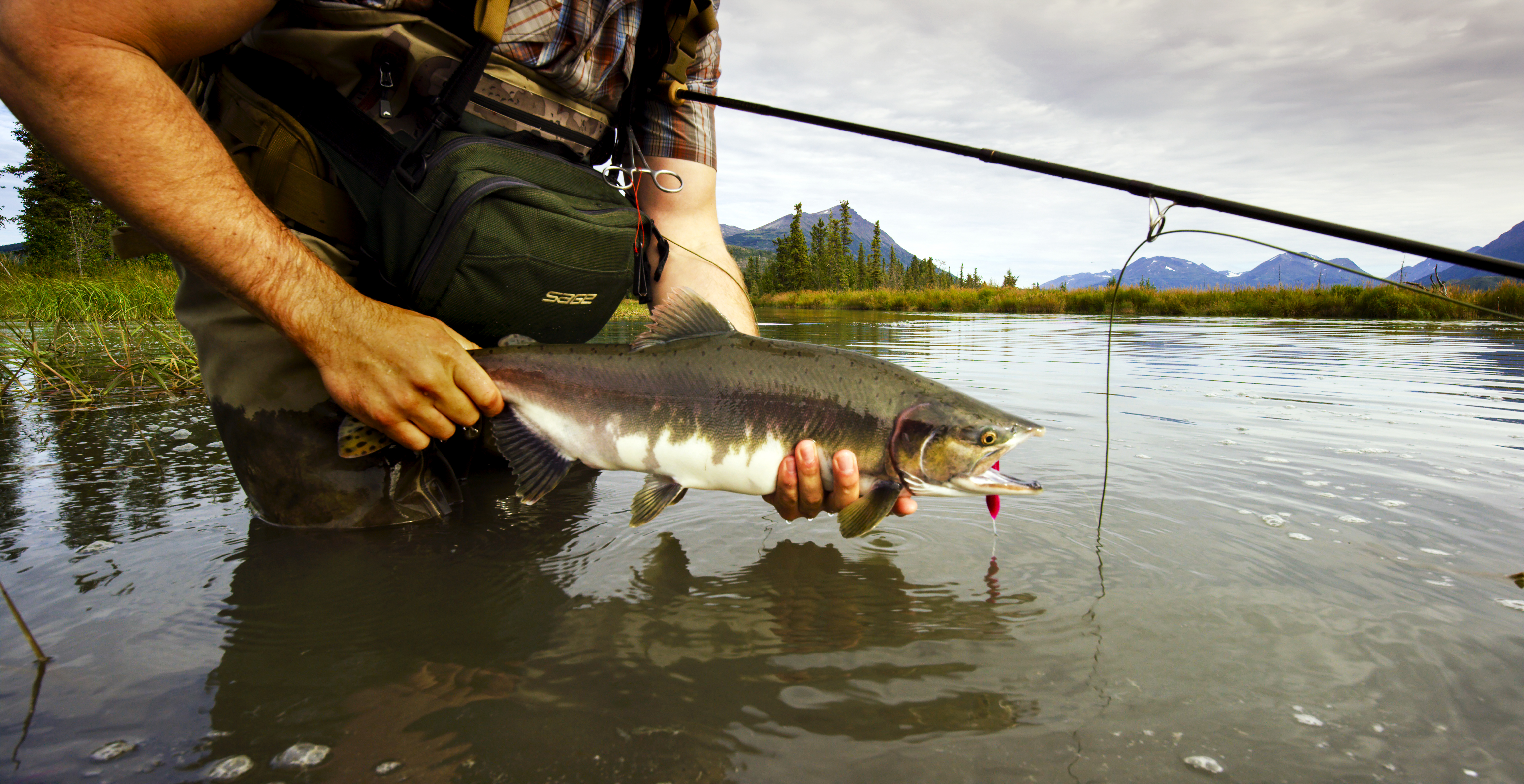 An angler holds a fresh-caught salmon at Kenai National Wildlife Refuge in Alaska.