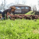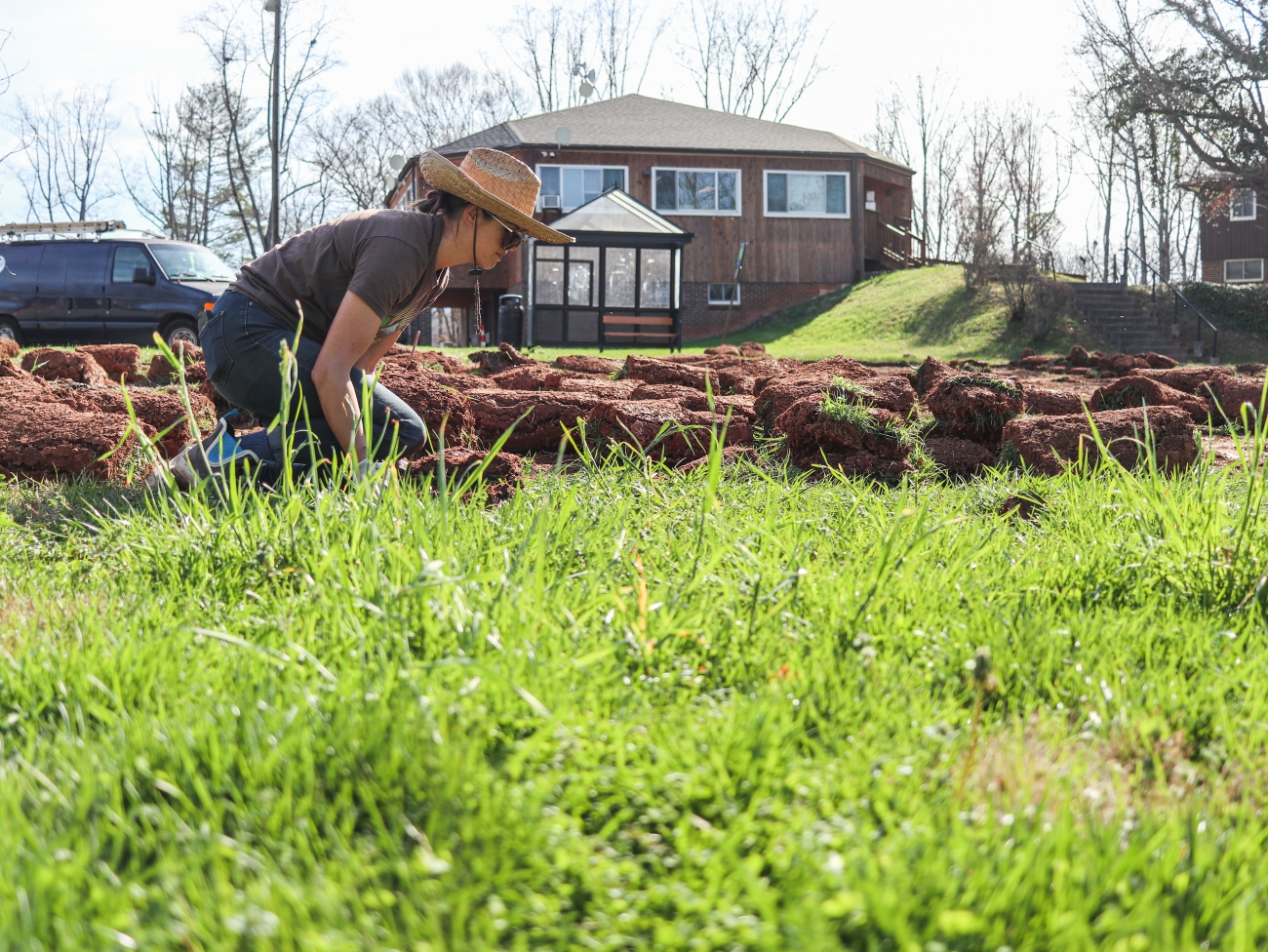 Chelsea Adams, of Asheville Greenworks, helps clear grass from the site of a pollinator garden installation at the Klondyke Housing Community, Asheville, North Carolina.