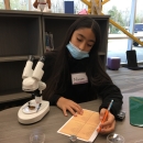 Fifth grade student Naomi Gonzales uses a microscope to inspect a butterfly during the "Be the Biologist" Junior Ranger Program at Trinity River National Wildlife Refuge in Fall 2021.