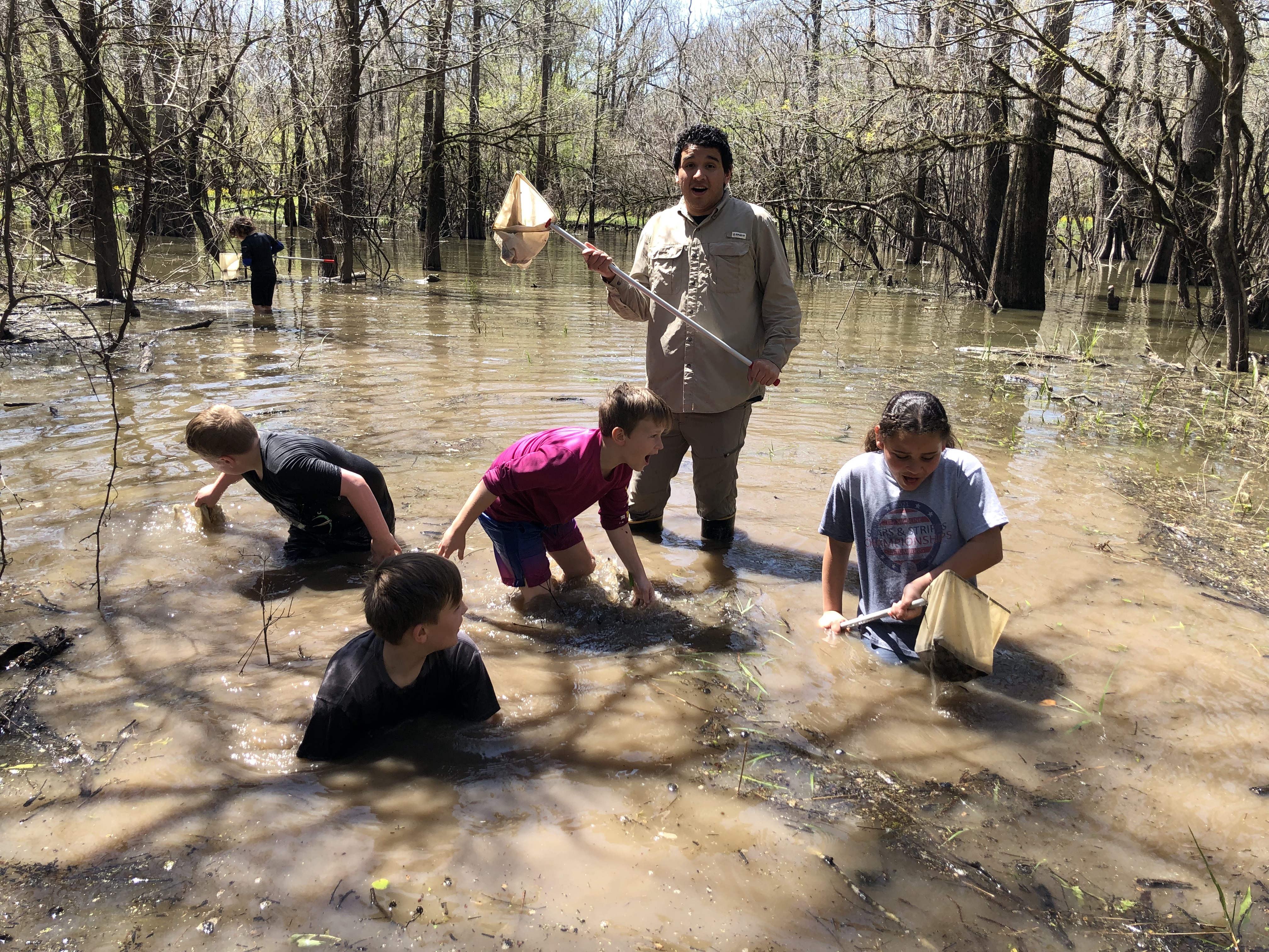 Children hunt for aquatic invertebrates during the "Be the Biologist" Junior Ranger Program at Trinity River National Wildlife Refuge in Fall 2021.