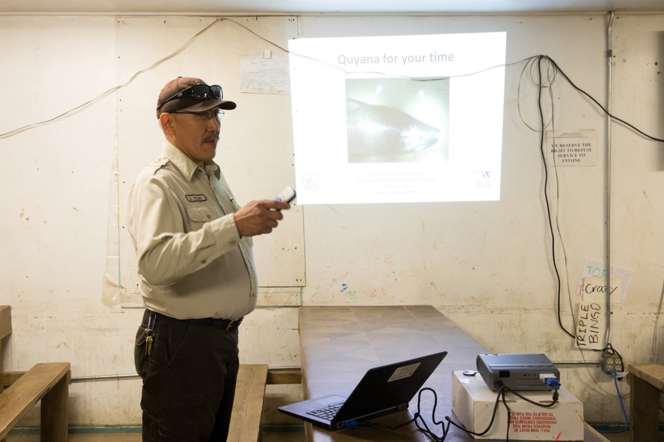 Salmon are incredibly important both culturally and nutritionally to the people of Alaska and they want to know how the runs are doing. Here, Chris Tulik, a Refuge Information Technician who serves as a liaison between the Kuskokwim River communities and fisheries managers and scientists, presents in Yupik at the village of Kwethluk.