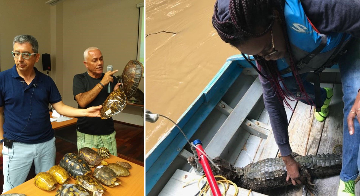 Left: CITES Master’s Course students learn about identification of CITES-listed turtle species. Photo by David Mahabir. Right: Adonika Spellen takes biological measurements of a black caiman as part of her CITES Master’s Course thesis. Photo courtesy of Adonika Spellen