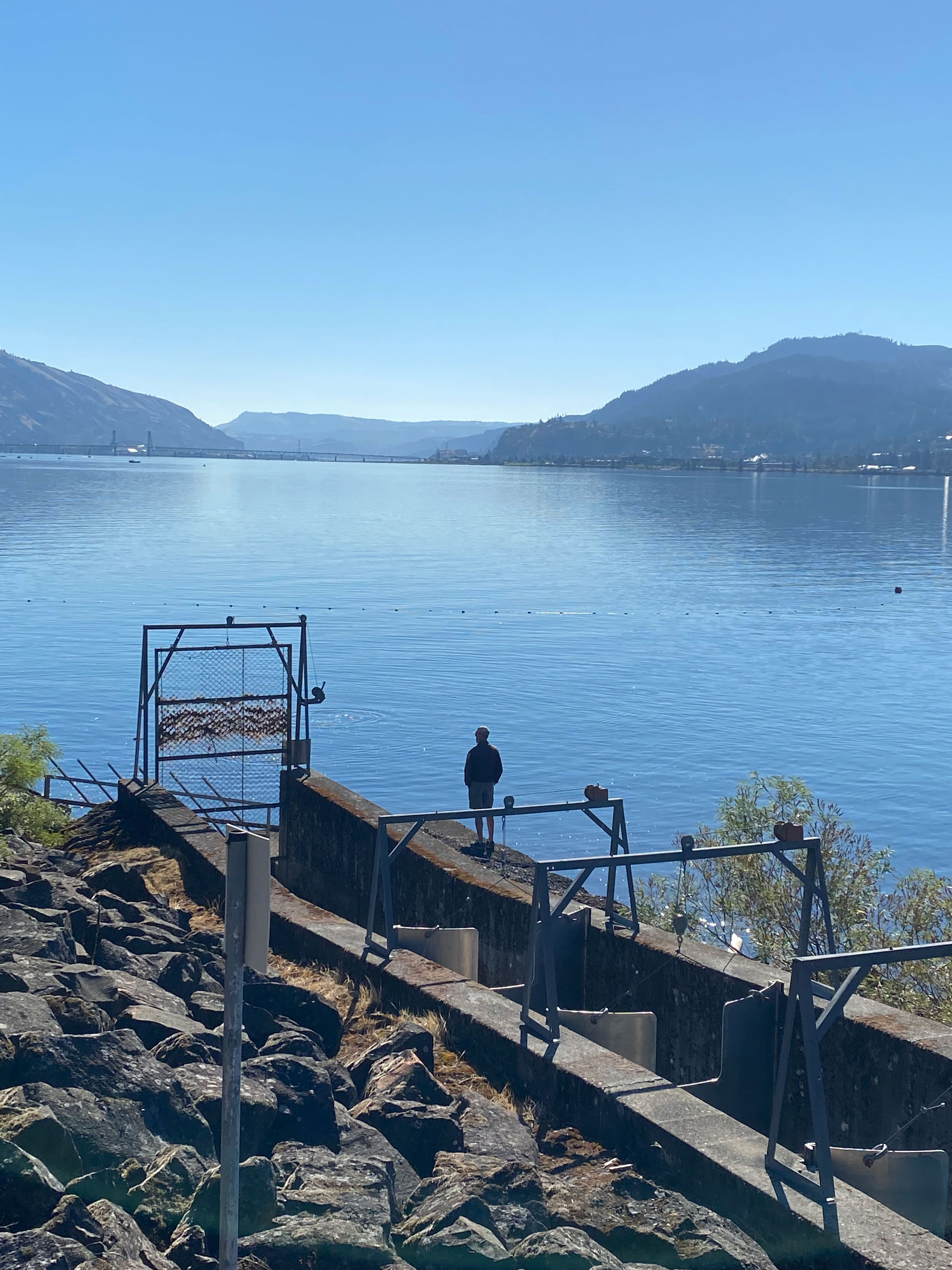 Hatchery manager, Dave Carie, looks out over the Columbia River at the mouth of the fish ladder.