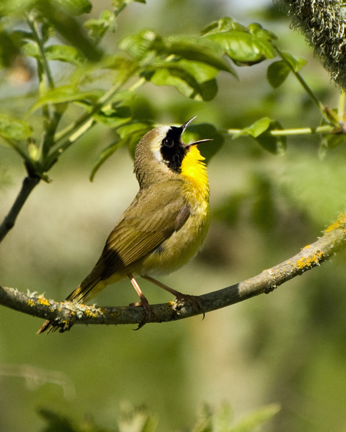 A common yellowthroat sings loudly while perched on a branch.