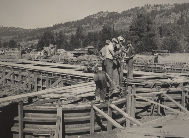 Construction workers place concrete walls for small rearing ponds at Leavenworth NFH in the summer of 1940.