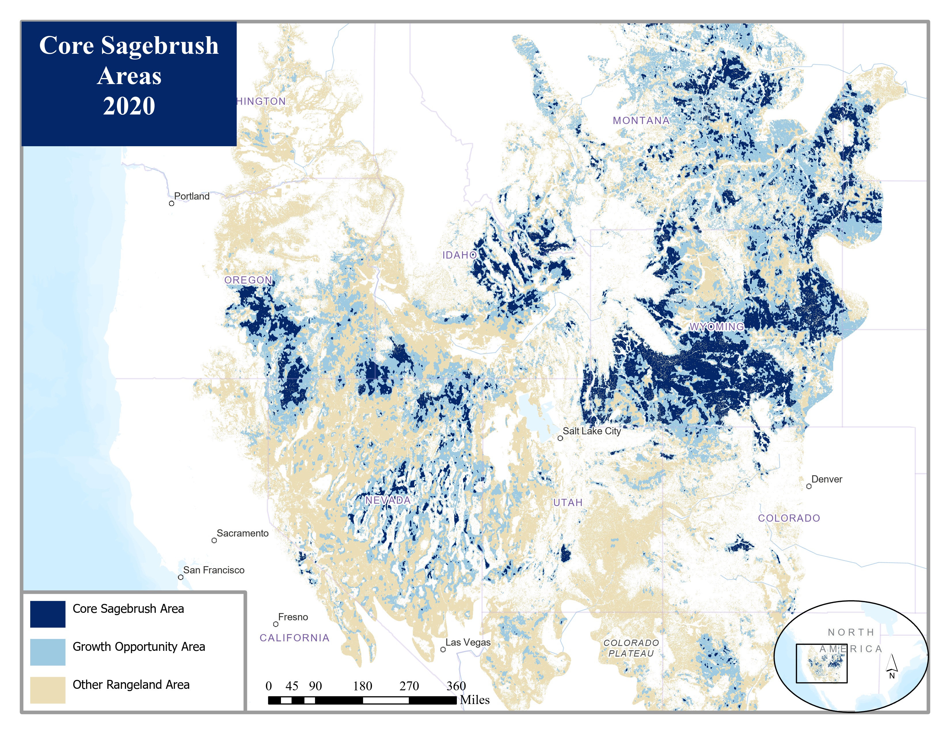Location of Core Sagebrush Areas, Growth Opportunity Areas, and Other Rangeland Areas identified within the sagebrush biome of the United States of America.
