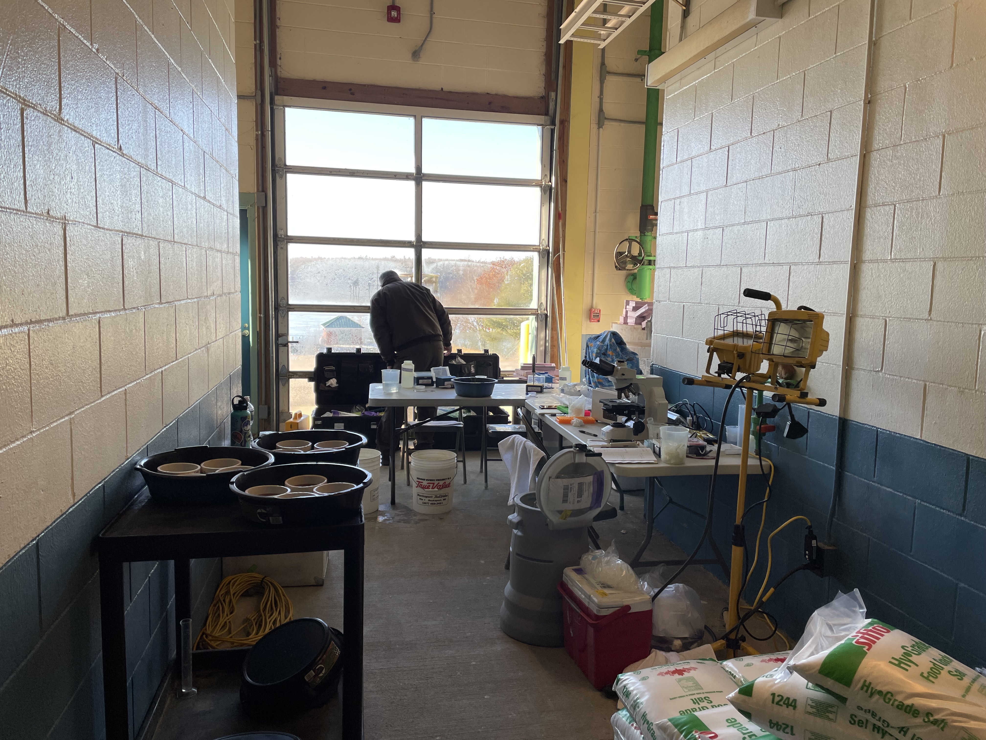A makeshift Cryopreservation lab set up in the Craig Brook hatchery. The Warm Springs Fish Technology Center ships microscopes and other laboratory equipment before they arrive on site.