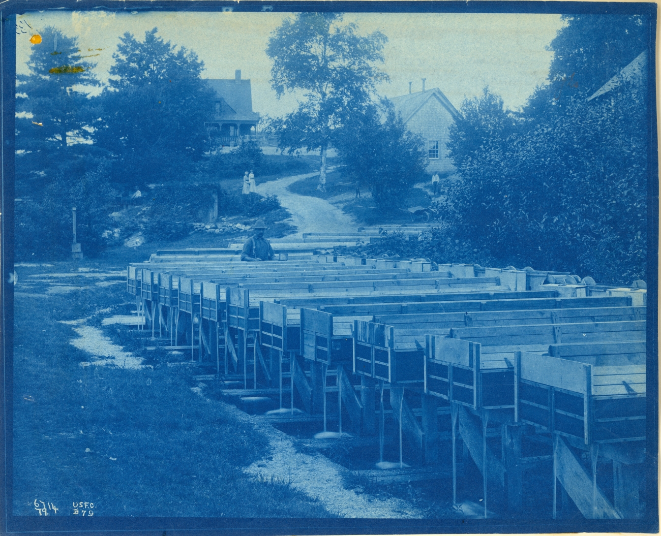 This historic image from the 1870's shows one of the U.S. Fish & Wildlife Services oldest National Fish Hatcheries, Craig Brook, located in Maine. The wooden troughs had water running through them with small salmon fingerlings. This image is one sample of thousands and blueprints, annual reports, stocking records, and more are also stored at the National Fish & Aquatic Conservation Archives.