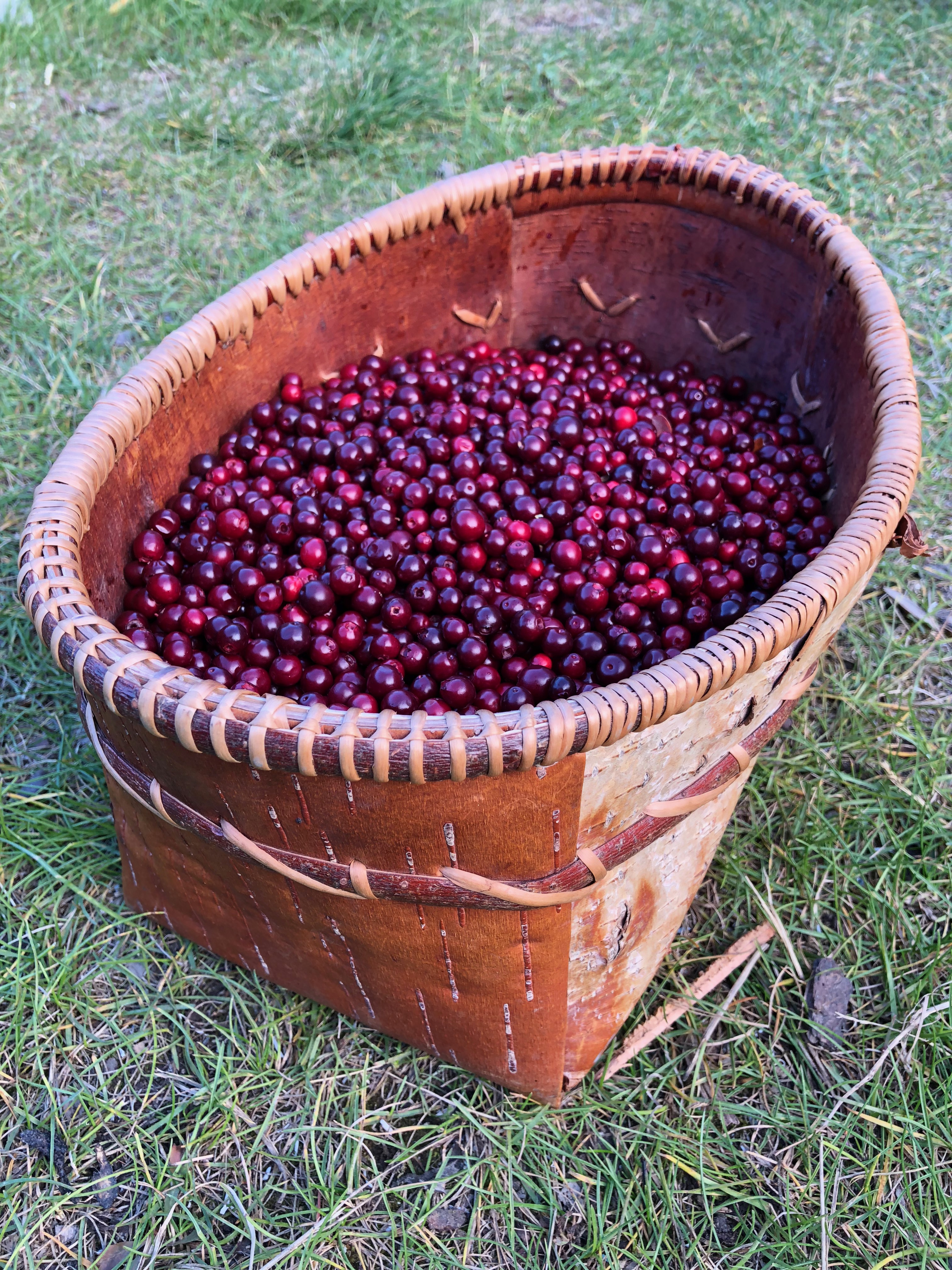 lowbush cranberries are one of several wild species sought out by local berry pickers - human and animal alike. Here the berries are held in a traditionally made birch-bark basket stitched together with spruce roots.