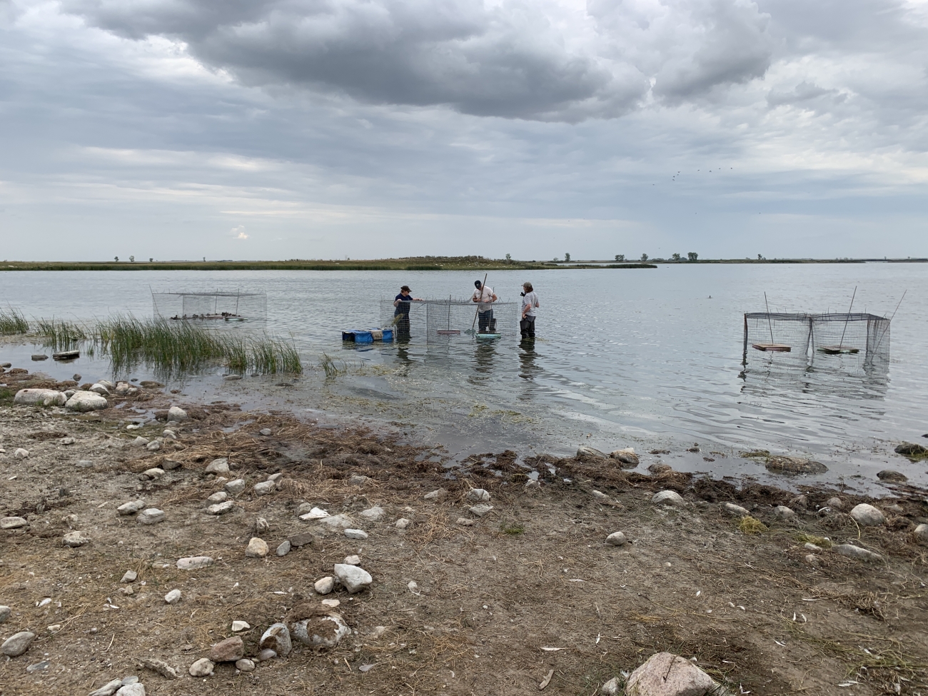 The crew in central Saskatchewan sets up the swim-in traps to catch ducks as part of the 2022 waterfowl banding operations led by the Migratory Bird Program.