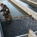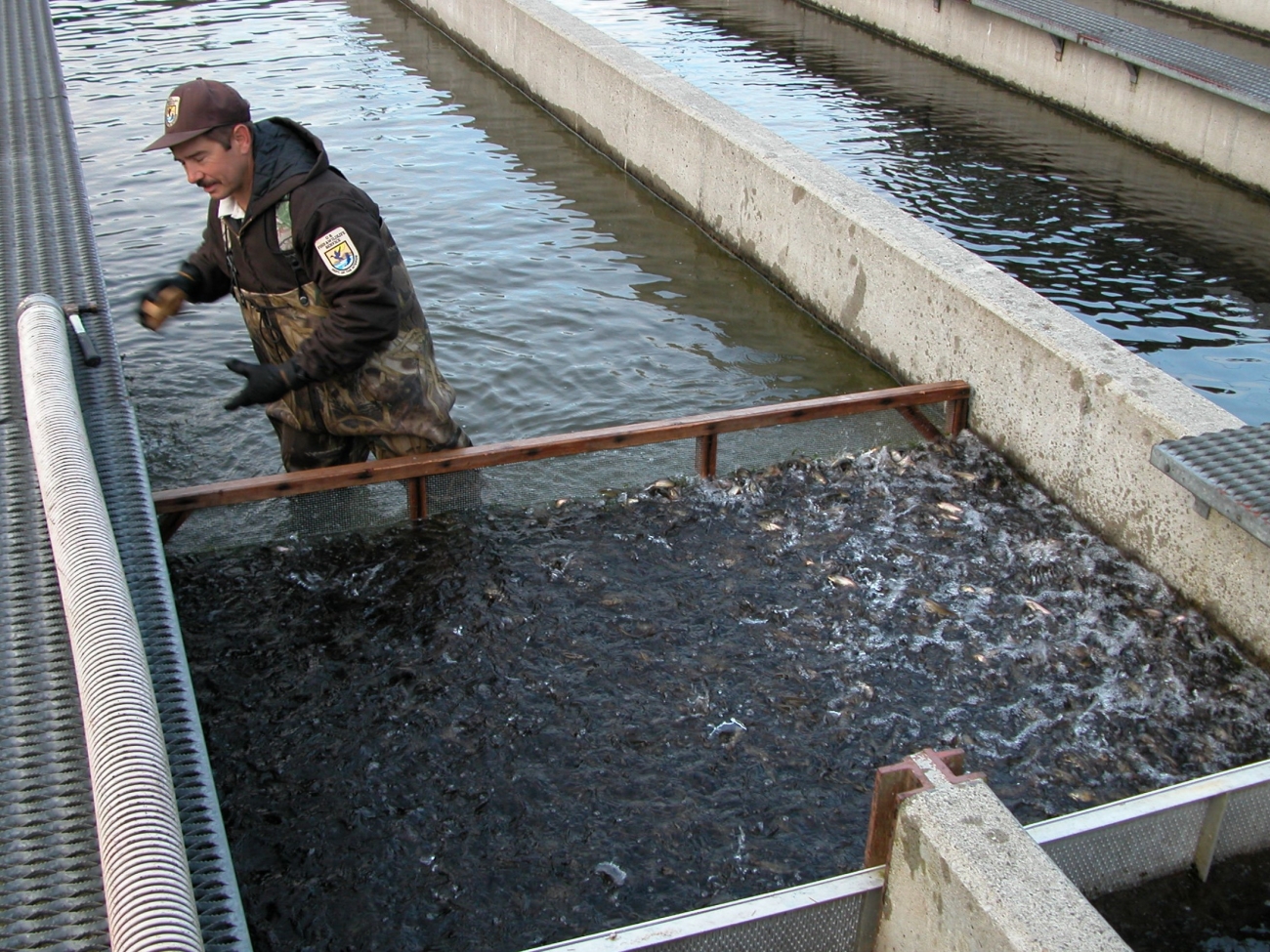 Quilcene National Fish Hatchery staff crowding ocean ready coho smolt in preparation for release into the Big Quilcene River