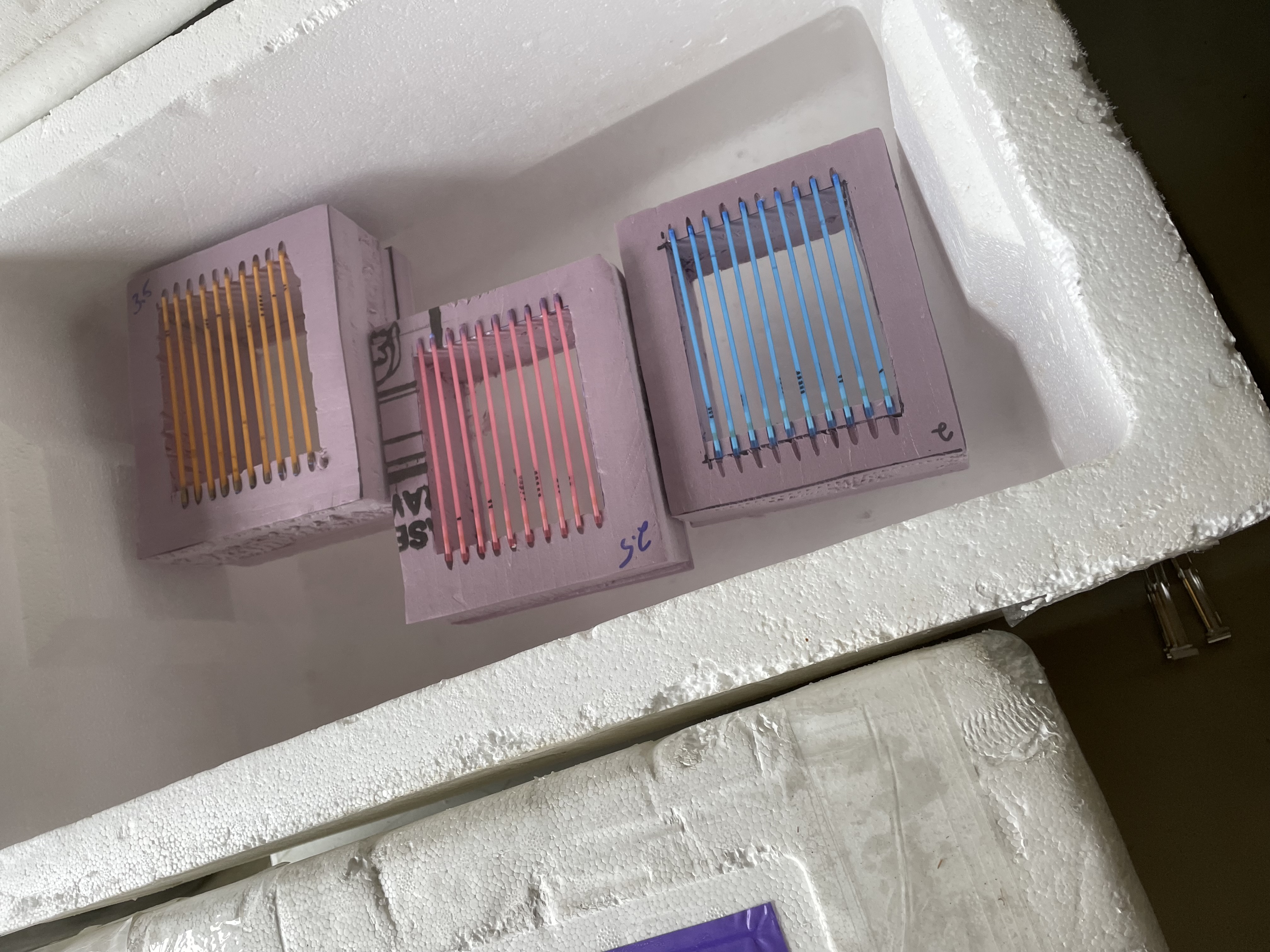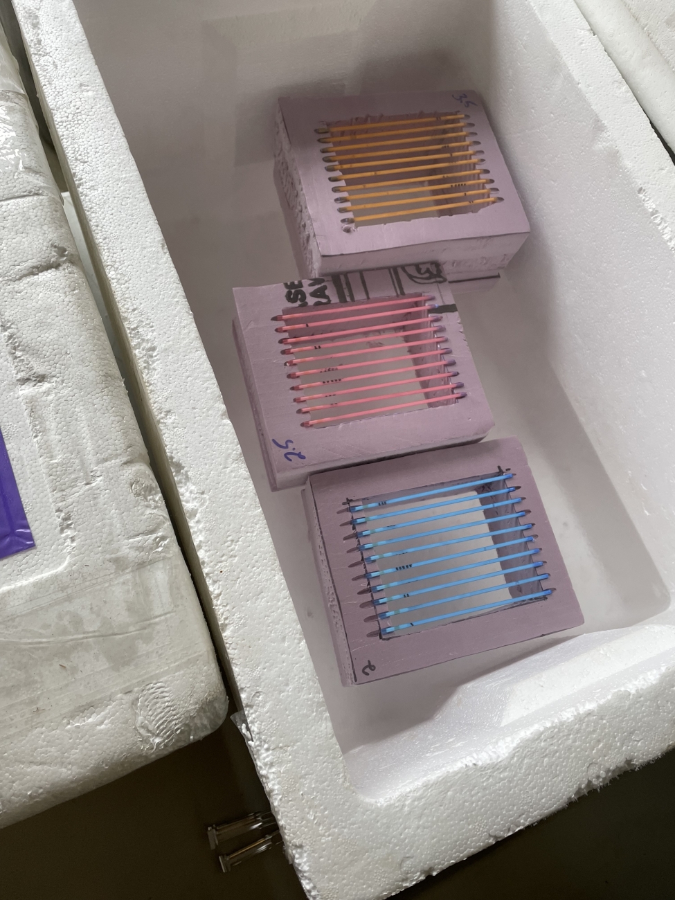 Straws full of Atlantic Salmon milt and cryoprotective solution being frozen on platforms floating on liquid nitrogen. The different platform heights correspond to different freezing rates.