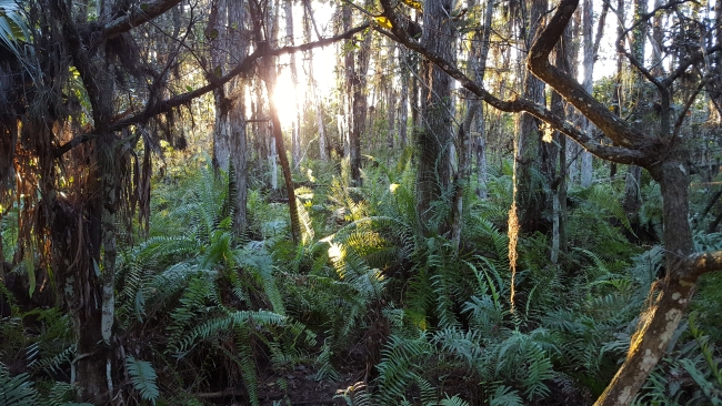 The sunset casts rays of light that dance off of green ferns and cypress trees covered in Spanish moss.