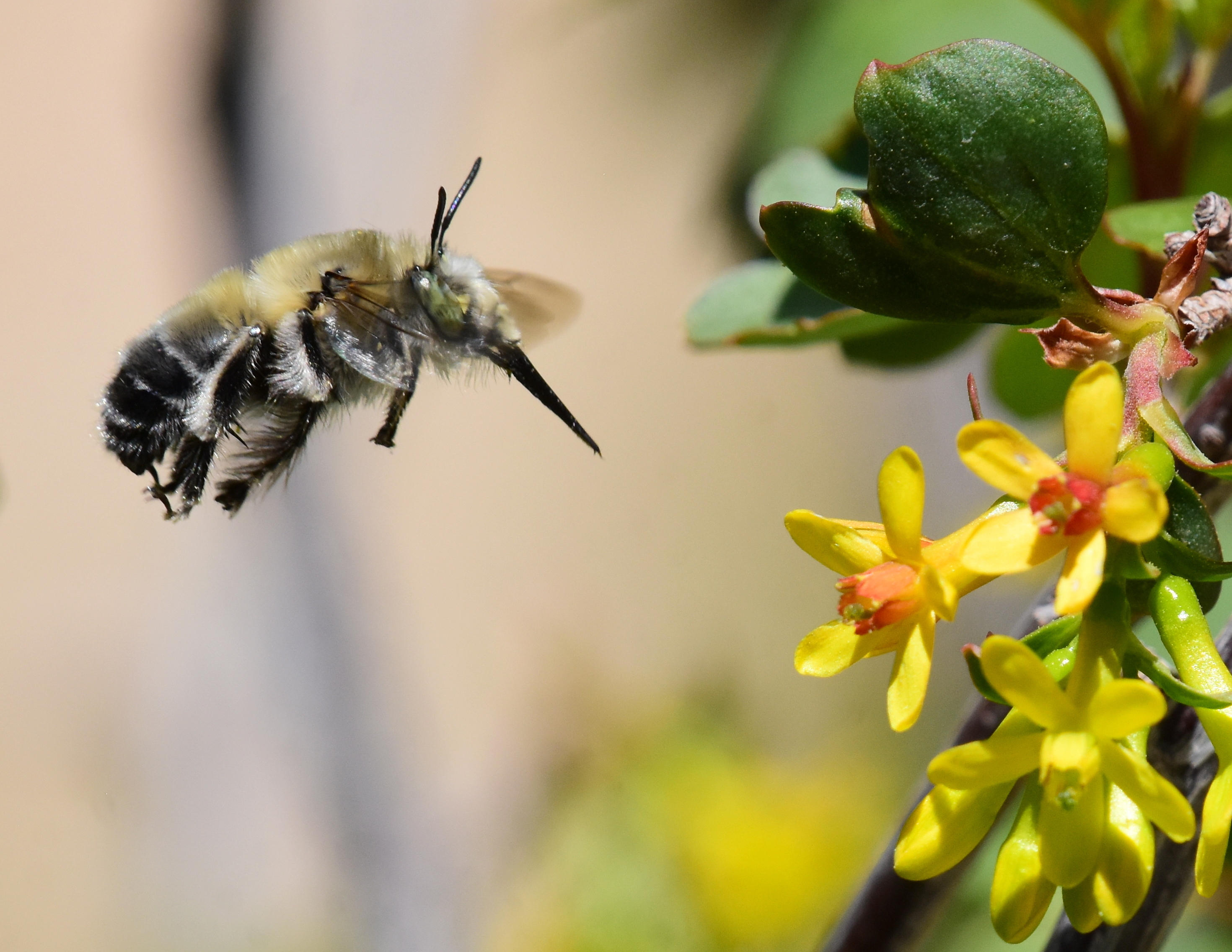A digger bee flying to feed on golden currant, which provides some the earliest native plant flowers for pollinators.