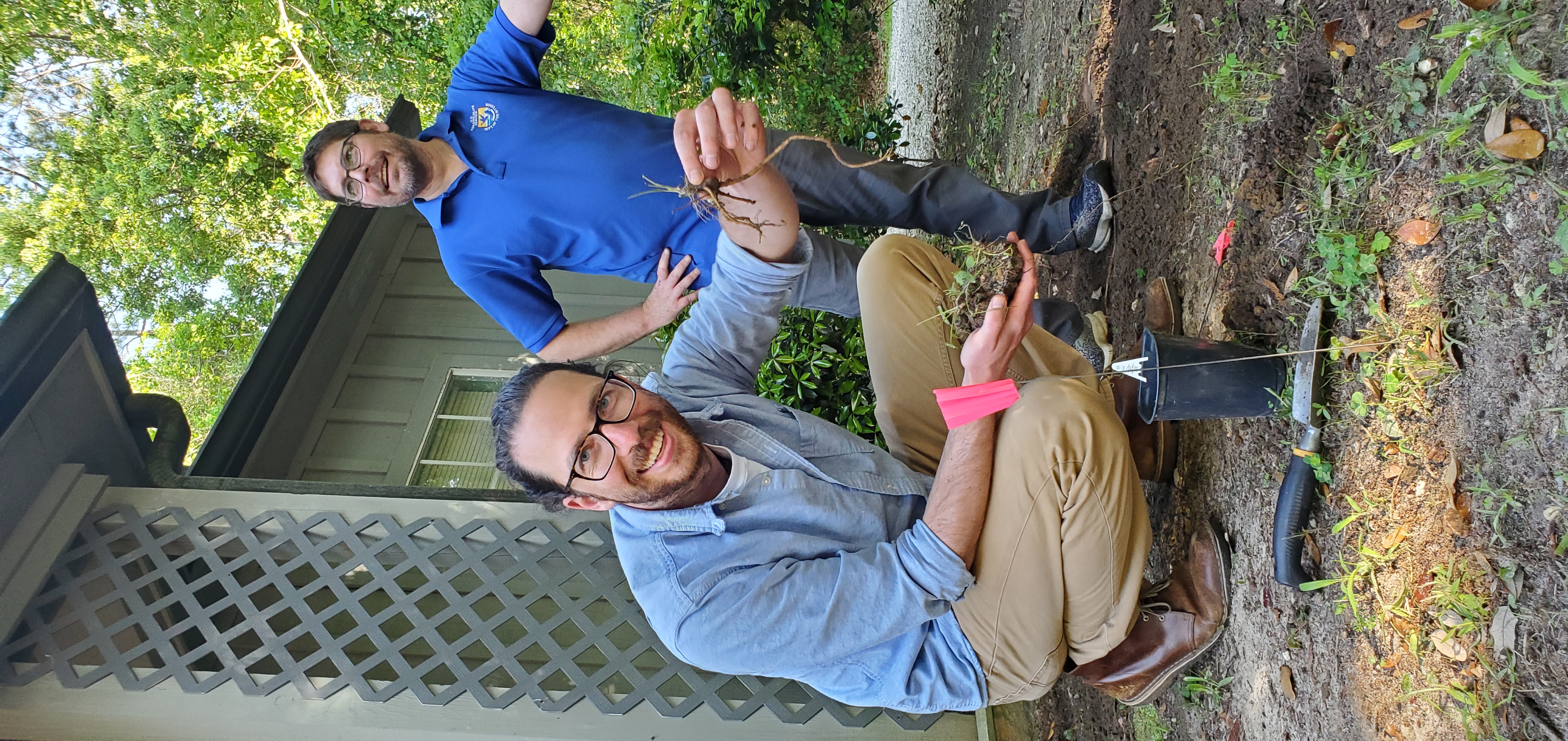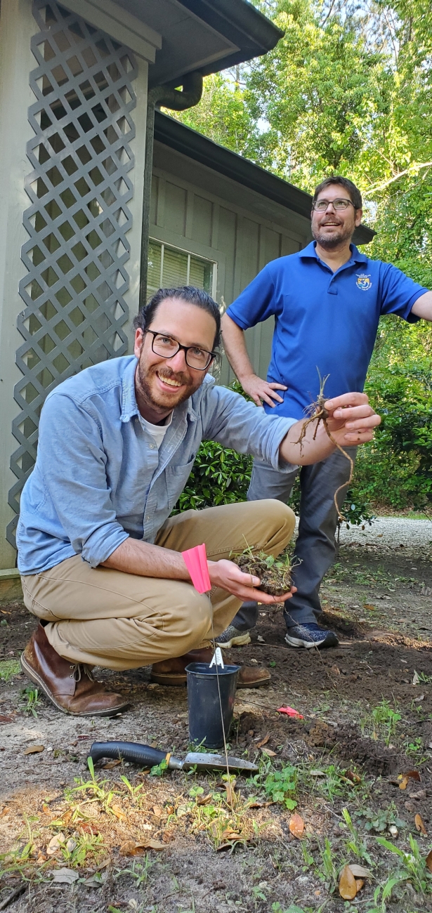Evan Collins and Drew Rollman look for existing plants to save before soil is prepped