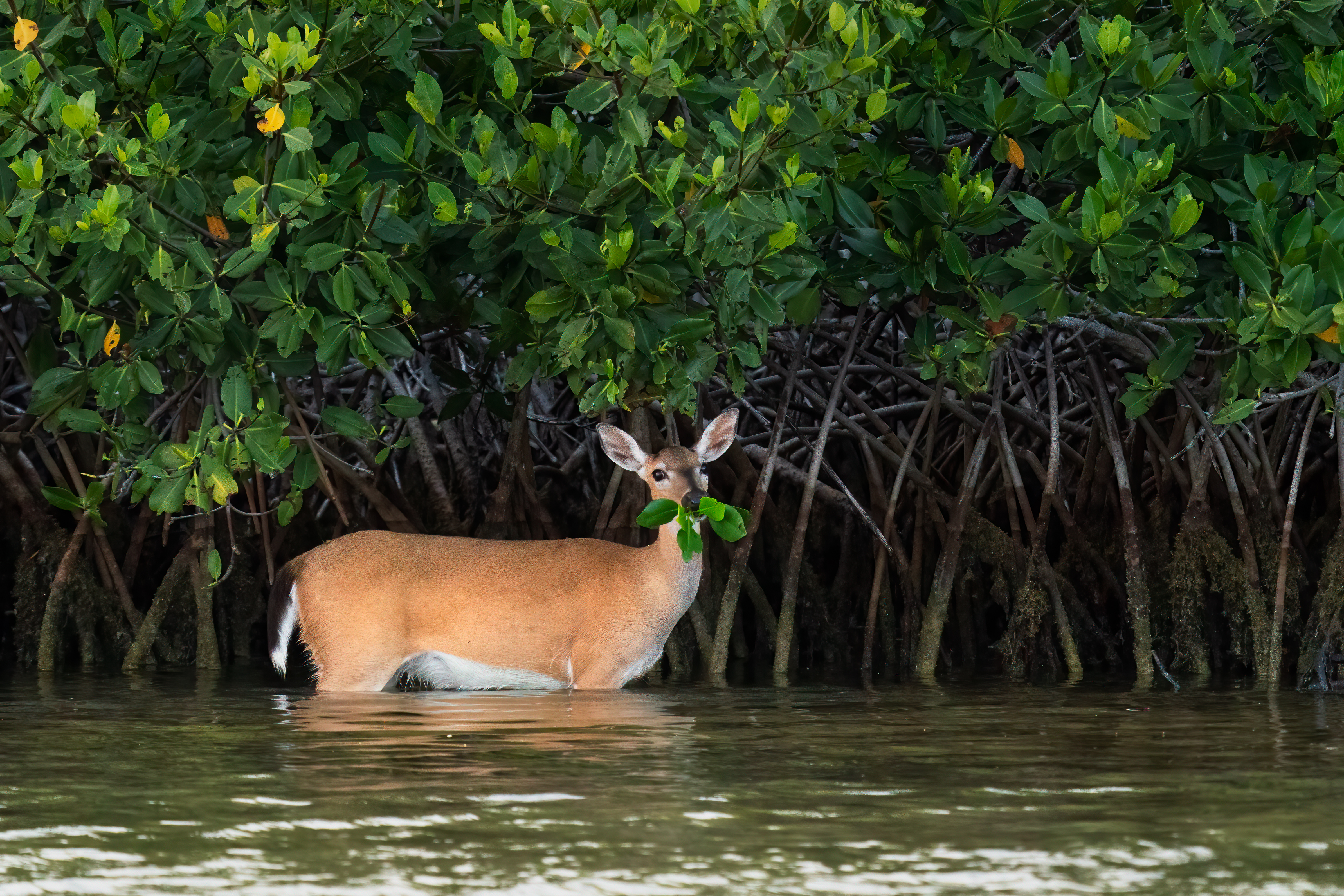 Key deer doe wading to red mangroves to forage. Photo by Kristie Killam.