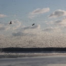 Eagles soar through a flock of ducks and geese in the winter's morning fog.