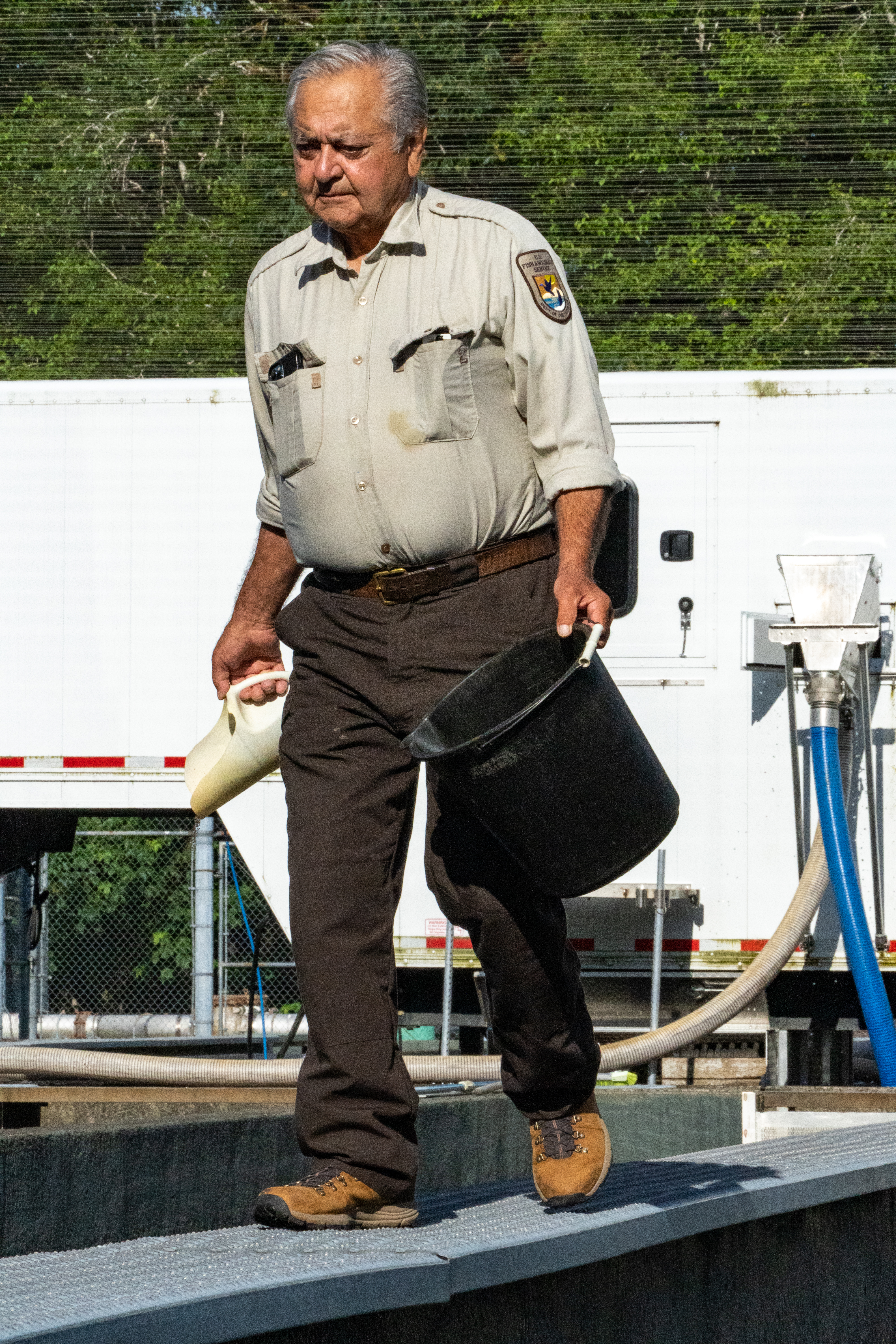 Ed Lemieux feeding fish at Quinault National Fish Hatchery.