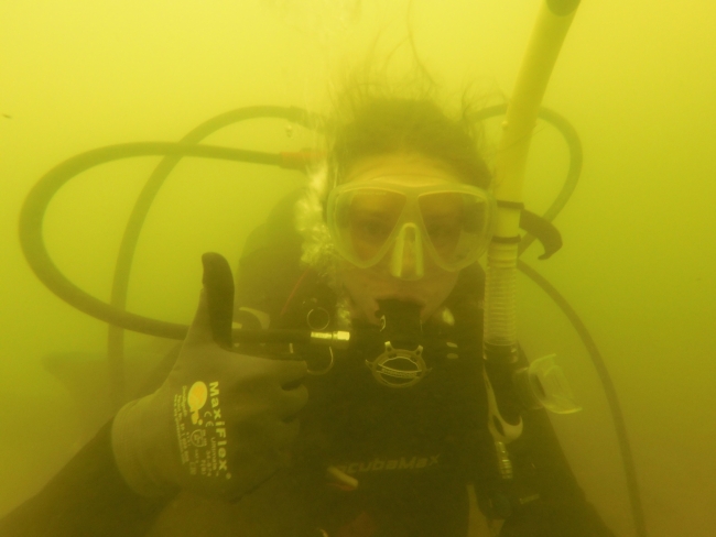 Refuge Biologist Elaine Barr during a survey. This is about as clear as the Ohio River gets - 6 feet of visibility!