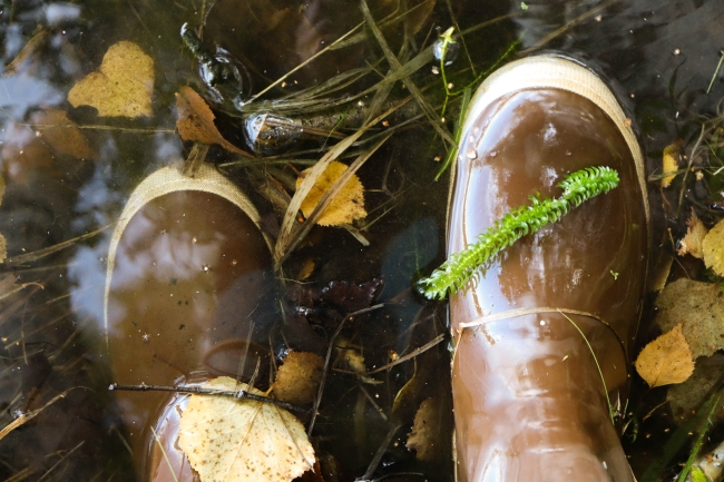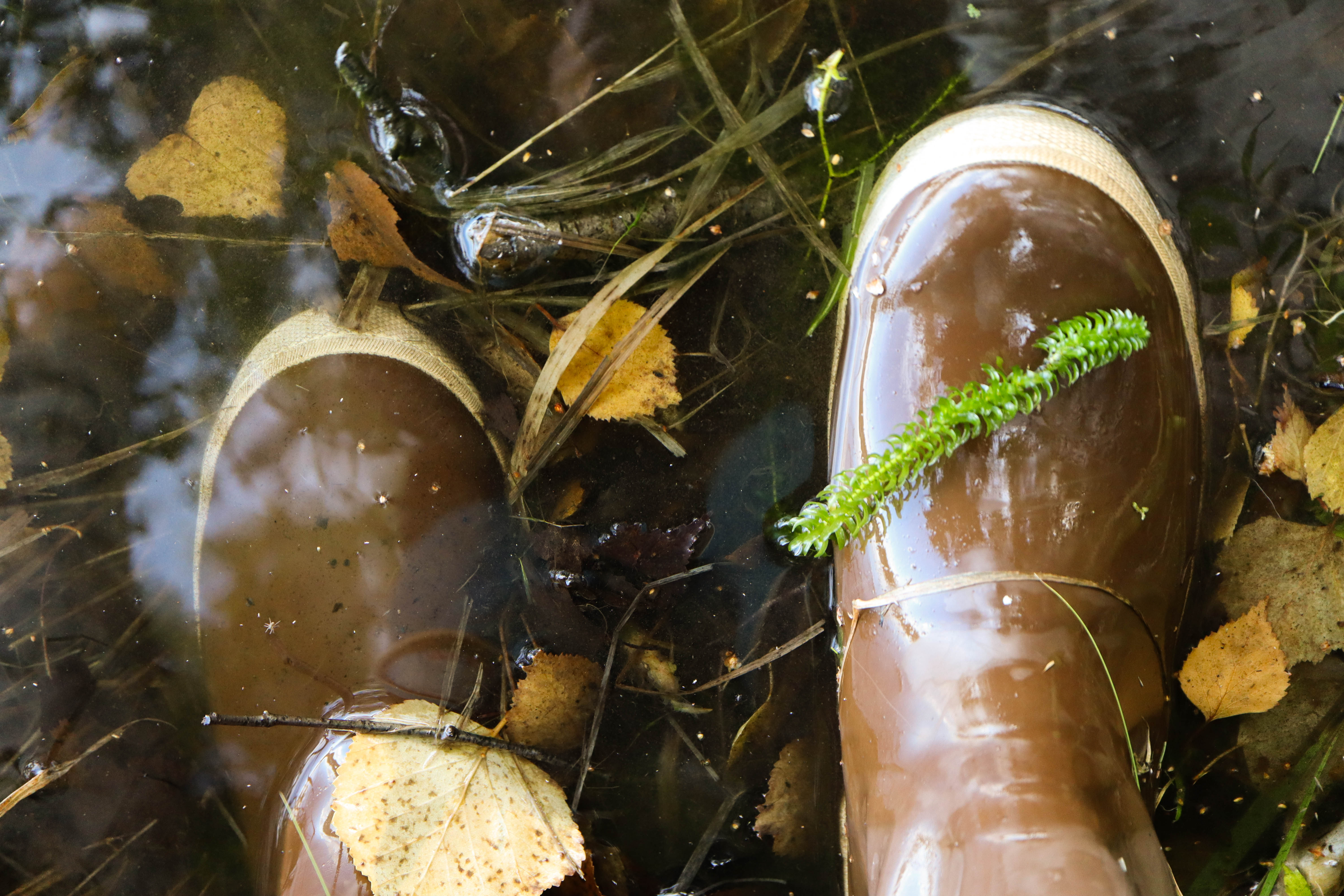 Strand of invasive Elodea on top of boot submerged in water.
