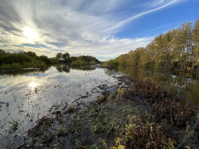 Emiquon's mosaic wetlands reflecting the autumn trees during sunset.