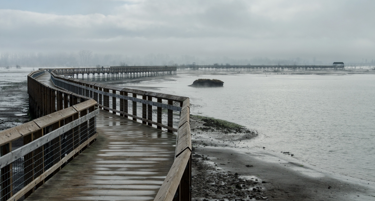 The Estuary Boardwalk at Billy Frank Jr. Nisqually National Wildlife Refuge extends over a mile across tidal mudflats.